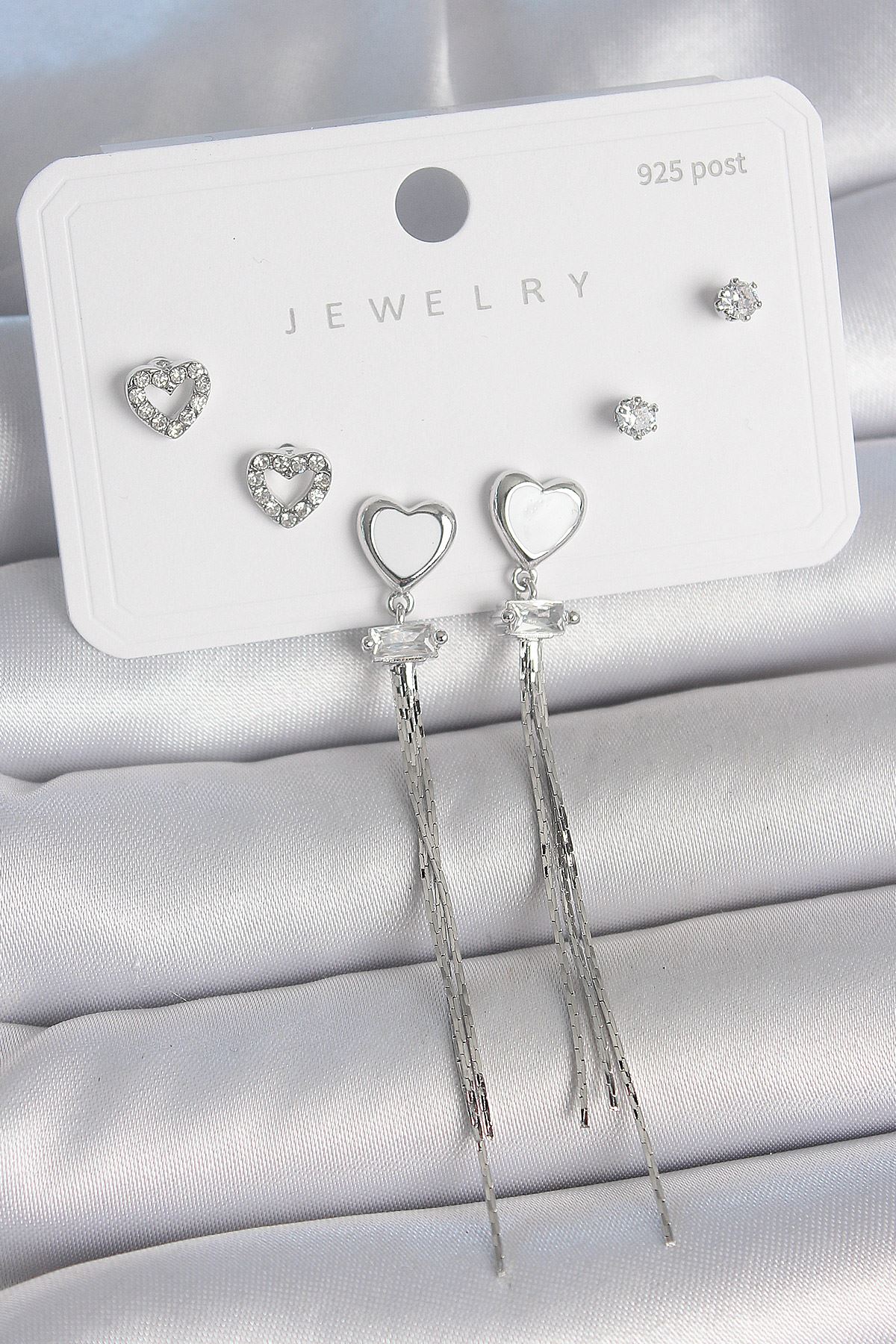 Pirinç Gümüş Sallantı Beyaz Mineli Kalp Model Zirkon Taşlı Kalp Detay 925 Ayar Gümüş Çivi Kadın Küpe Seti - TJ-BKP10495