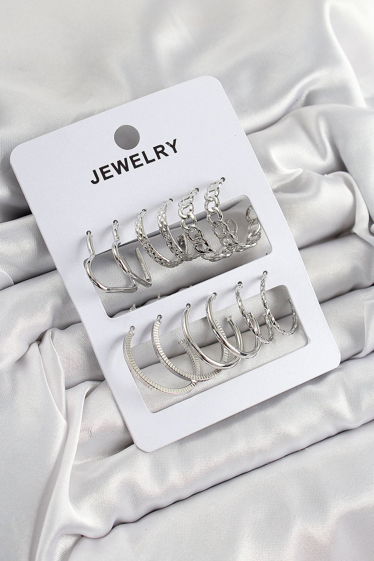 Pirinç Karışık Halka Model Gümüş Renk 6 Çift Kadın Küpe Set - TJ-BKP10876