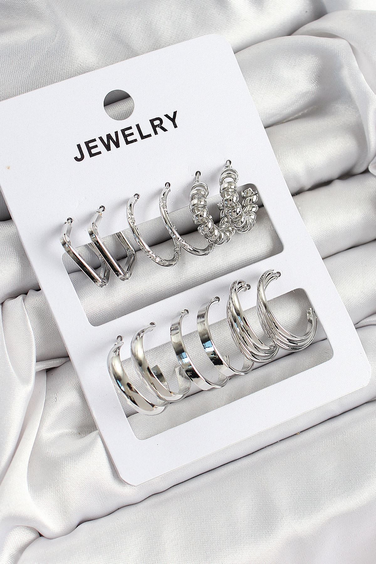 Pirinç Karışık Halka Model Gümüş Renk 6 Çift Kadın Küpe Set - TJ-BKP10888