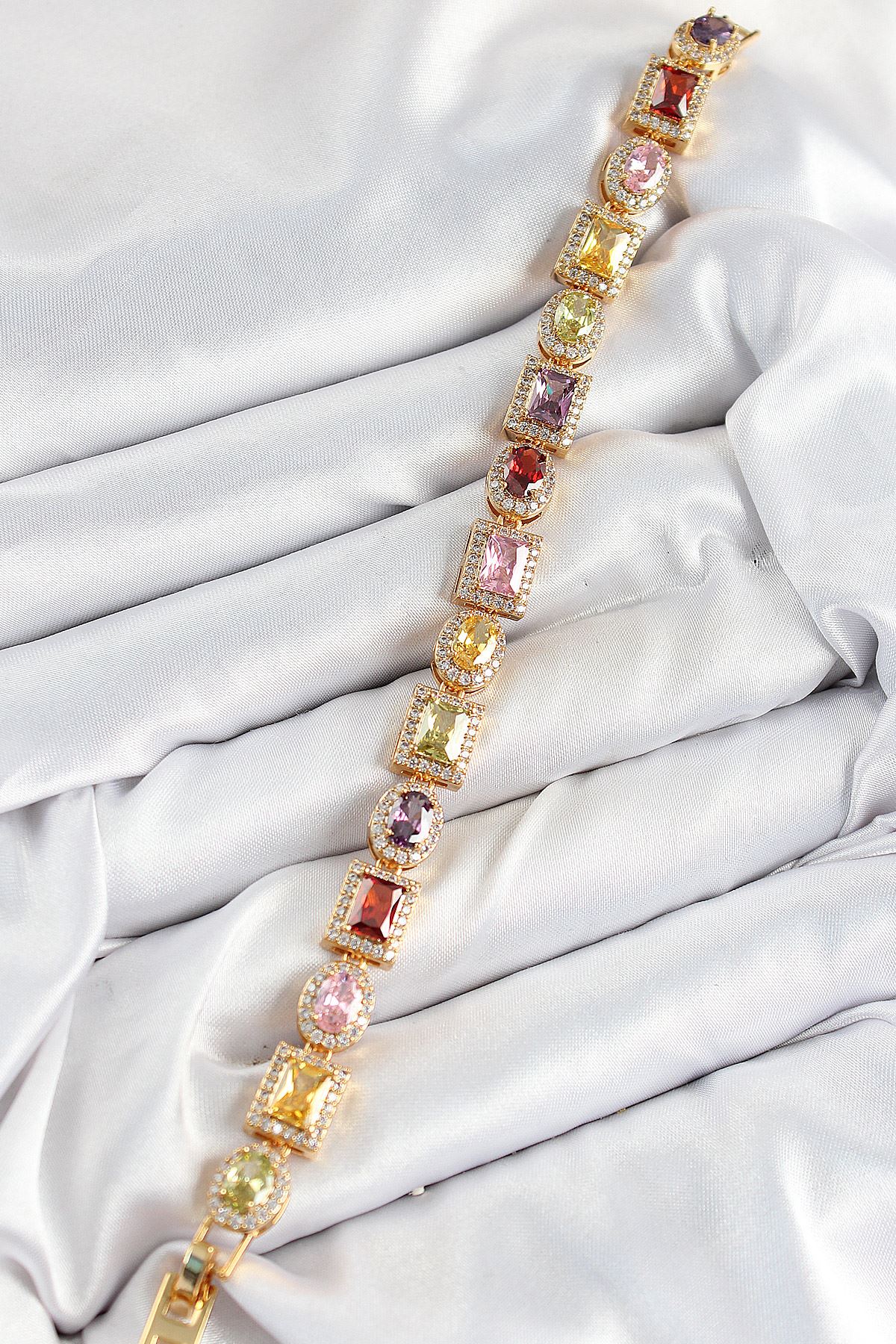 Pirinç Karışık Zirkon Taşlı Dikdörtgen Model Gold Renk Lastikli Kadın Bileklik - TJ-BB7493