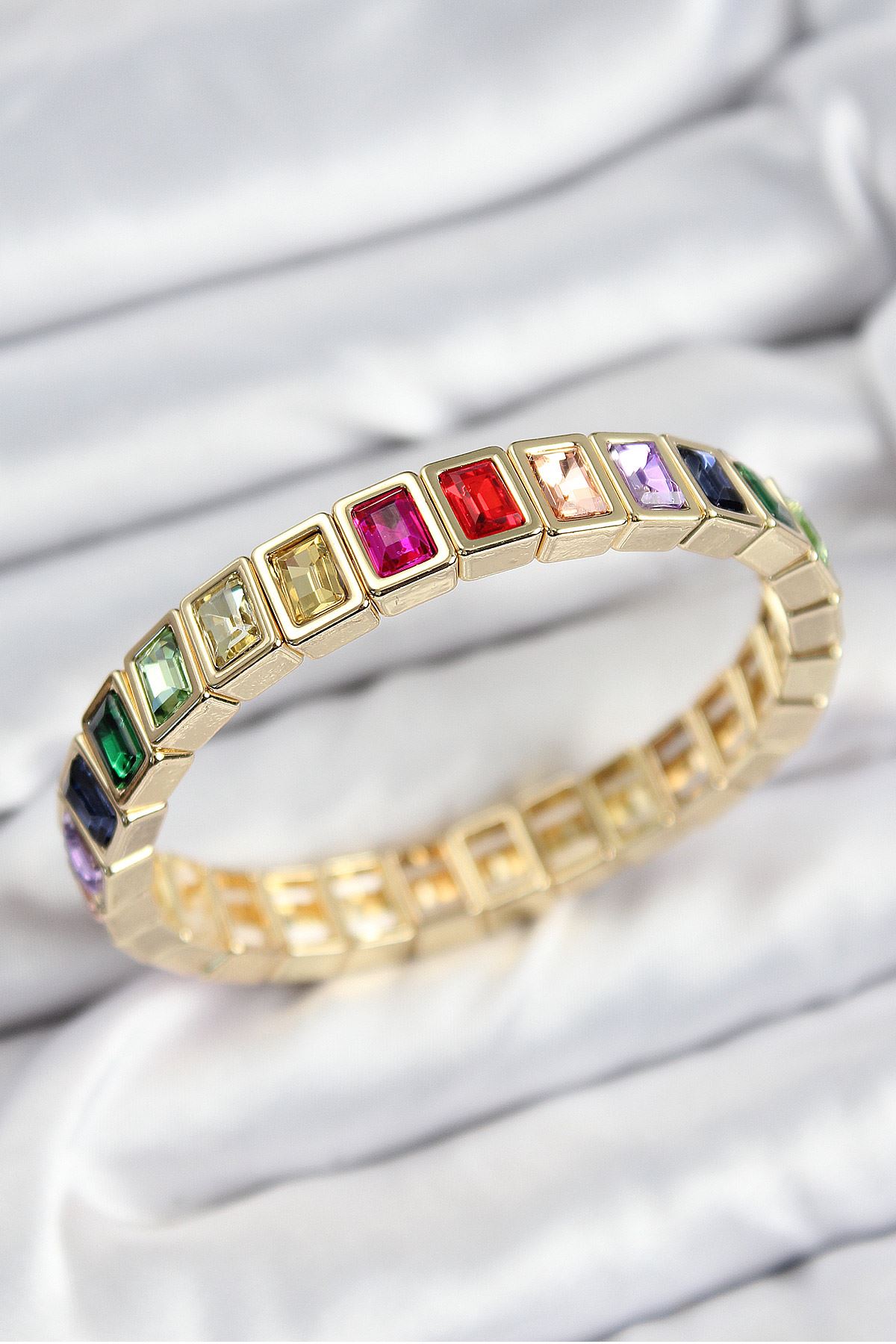 Pirinç Karışık Zirkon Taşlı Dikdörtgen Model Gold Renk Lastikli Kadın Bileklik - TJ-BB7493