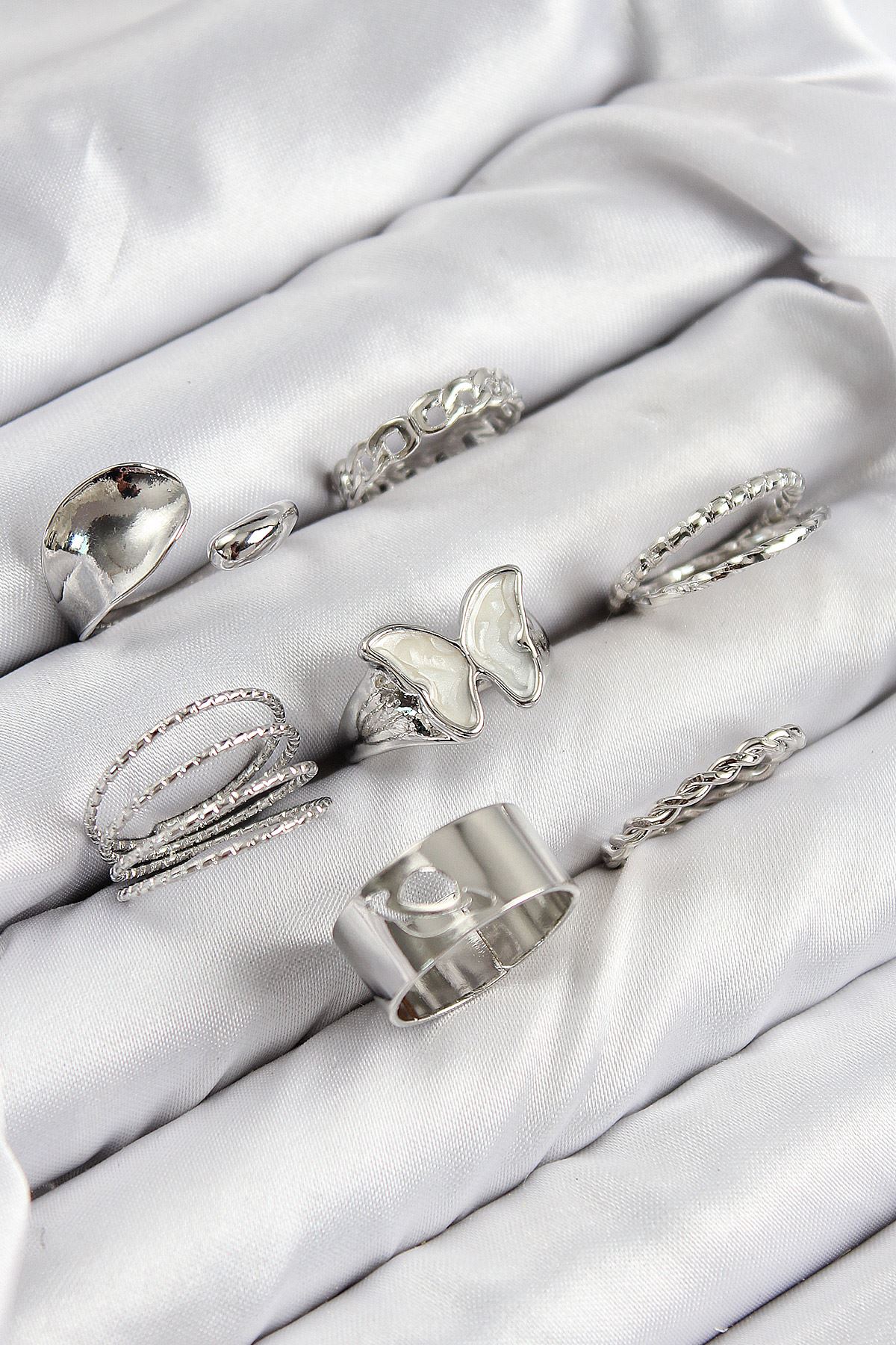 Pirinç Kelebek Model Gümüş Renk Kadın Yüzük Kombin Set - TJ-BYK3814