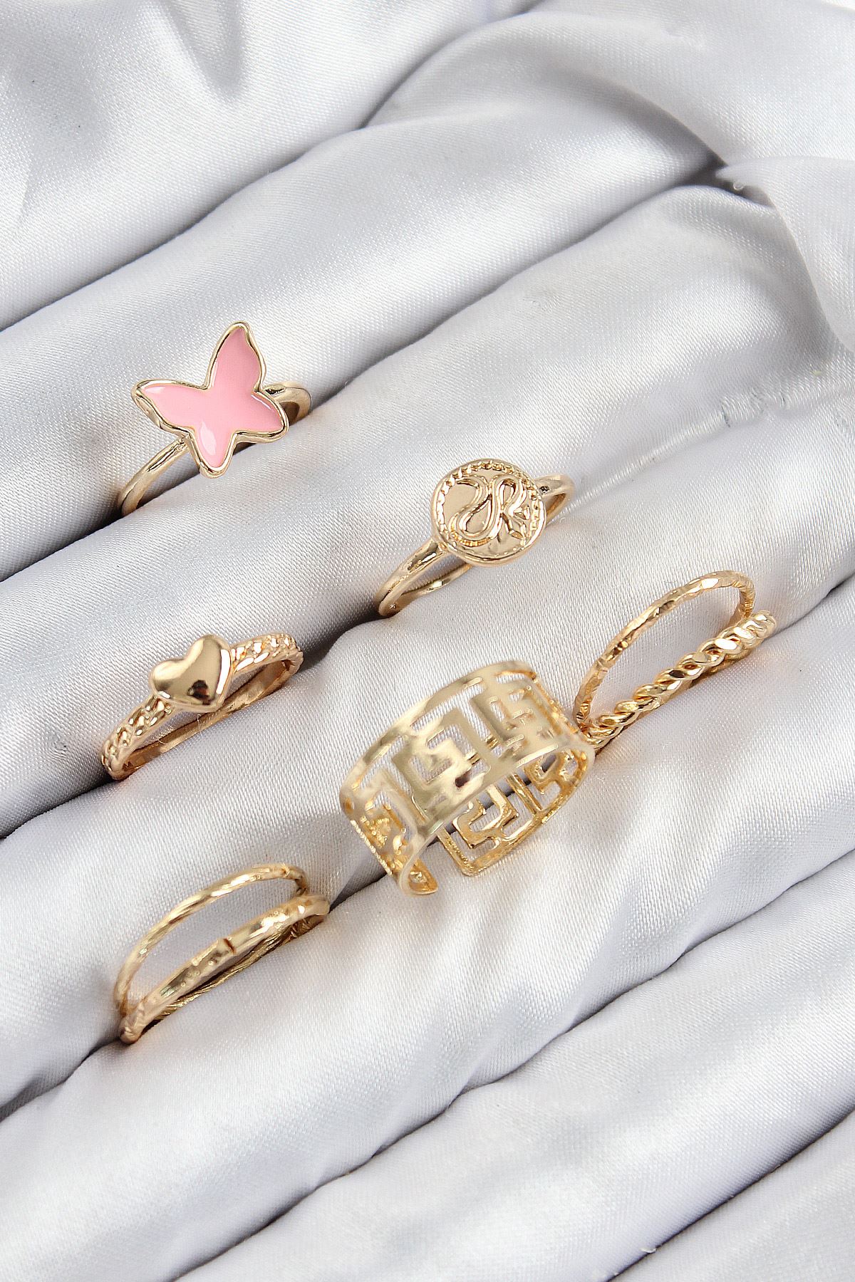 Pirinç Kelebek Ve Kalp Model Gold Renk Kadın Yüzük Kombin Set - TJ-BYK3817