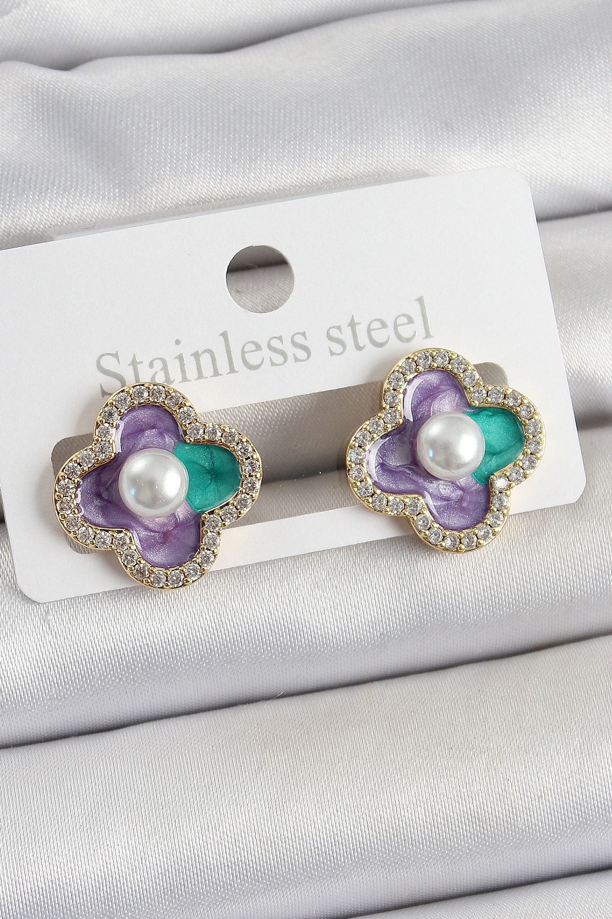 Pirinç Mor Mineli İnci Detaylı Zirkon Taşlı Sanatsal Portre Yonca Model Gold Renk Kadın Küpe - TJ-BKP10680