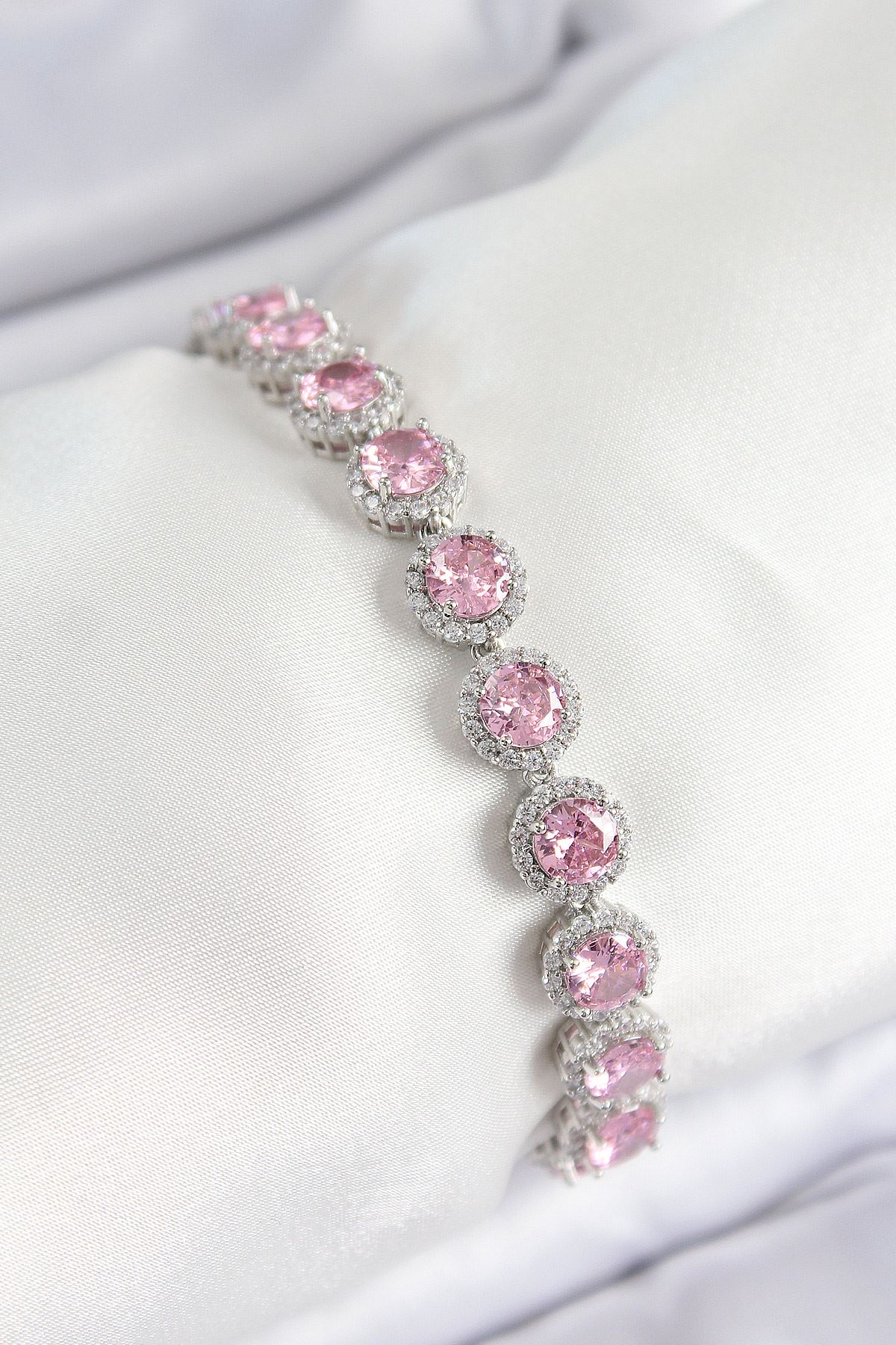 Pirinç Pembe Zirkon Taşlı Daire Baget Model Gümüş Renk VIP Seri Kadın Bileklik - TJ-BB7511