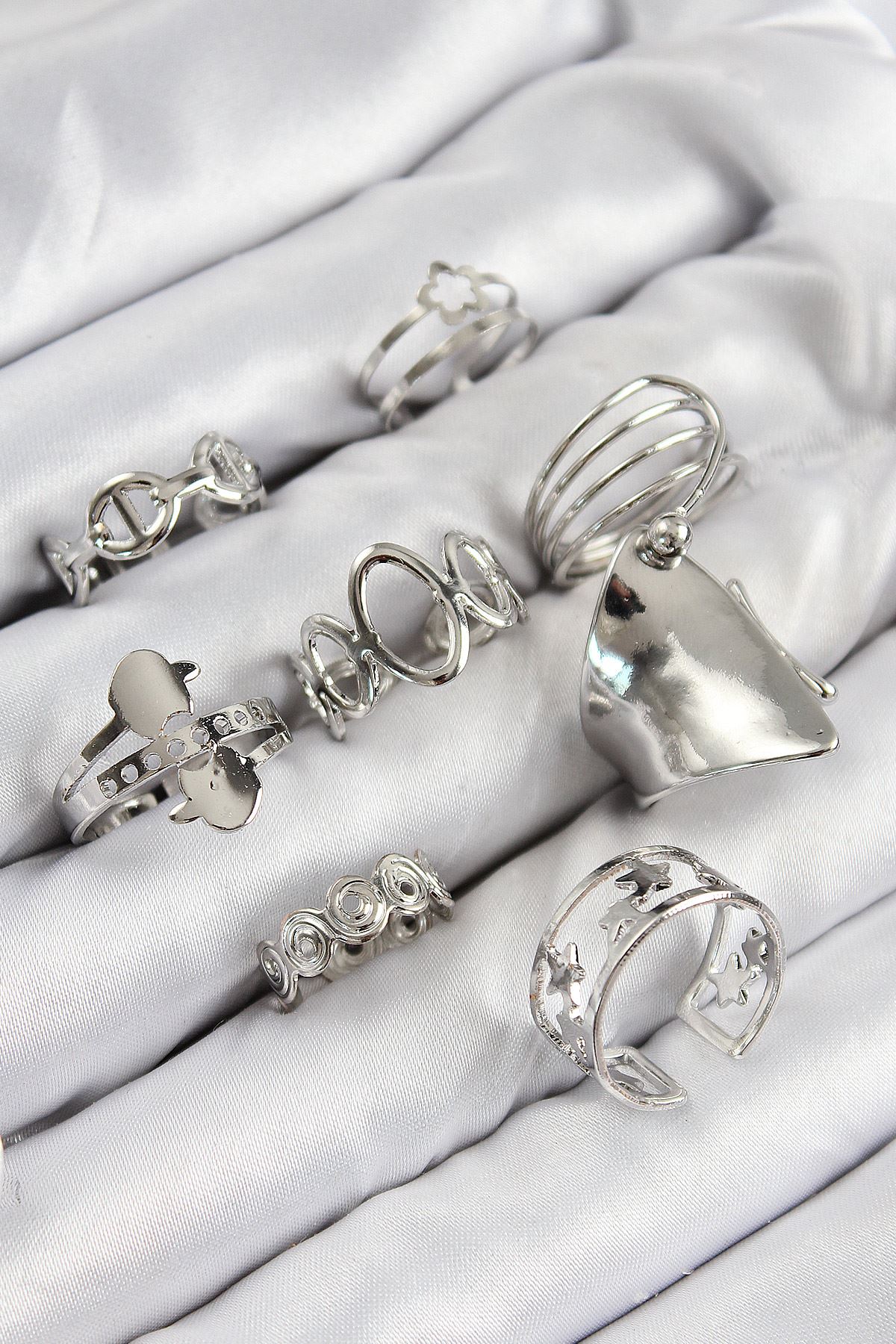 Pirinç Sarmal Ve Yıldız Model Gümüş Renk Kadın Yüzük Kombin Set - TJ-BYK3812