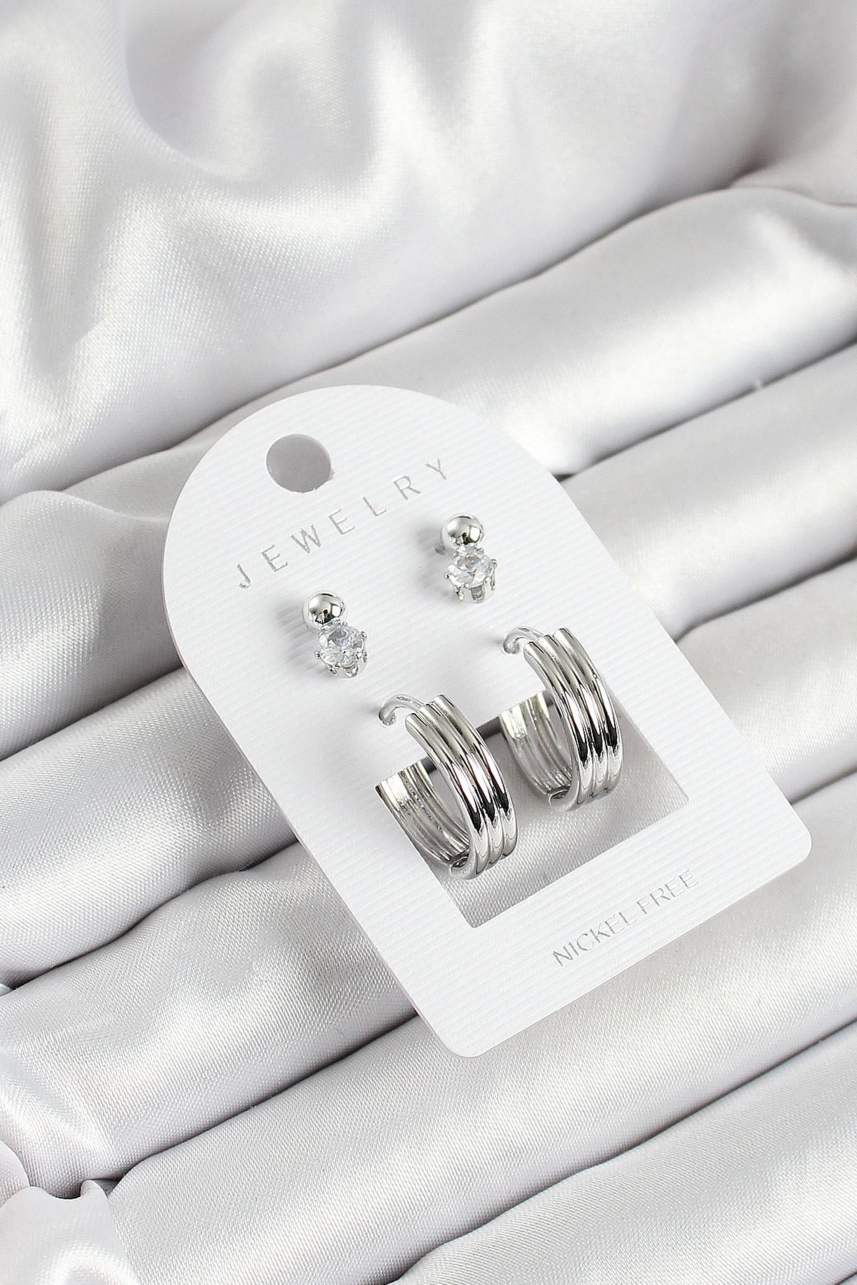 Pirinç Zirkon Taş Ve Halka Figürlü Gümüş Renk 3'lü Çift Kadın Küpe Set - TJ-BKP10649