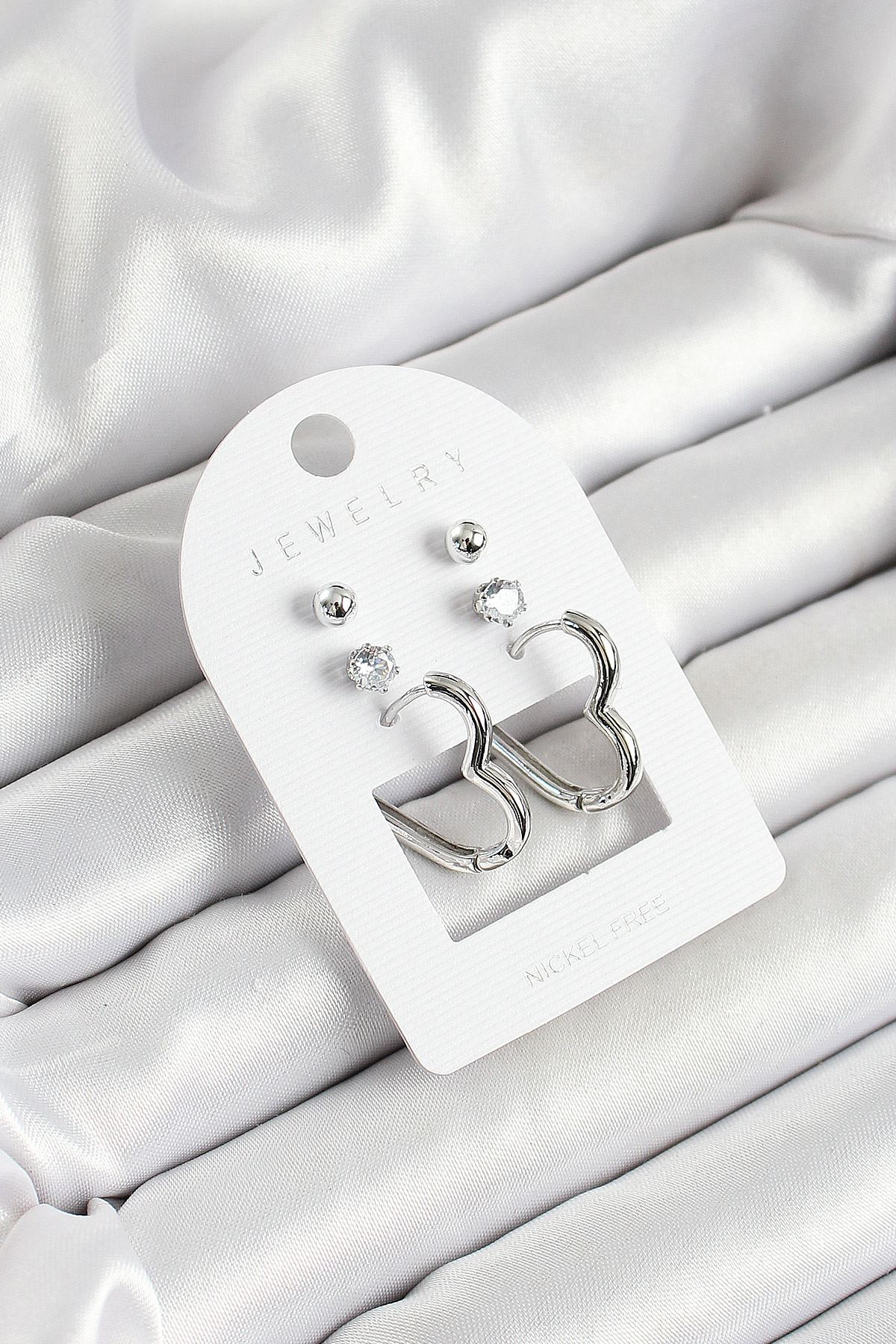 Pirinç Zirkon Taş Ve Kalp Figürlü Gümüş Renk 3'lü Çift Kadın Küpe Set - TJ-BKP10644