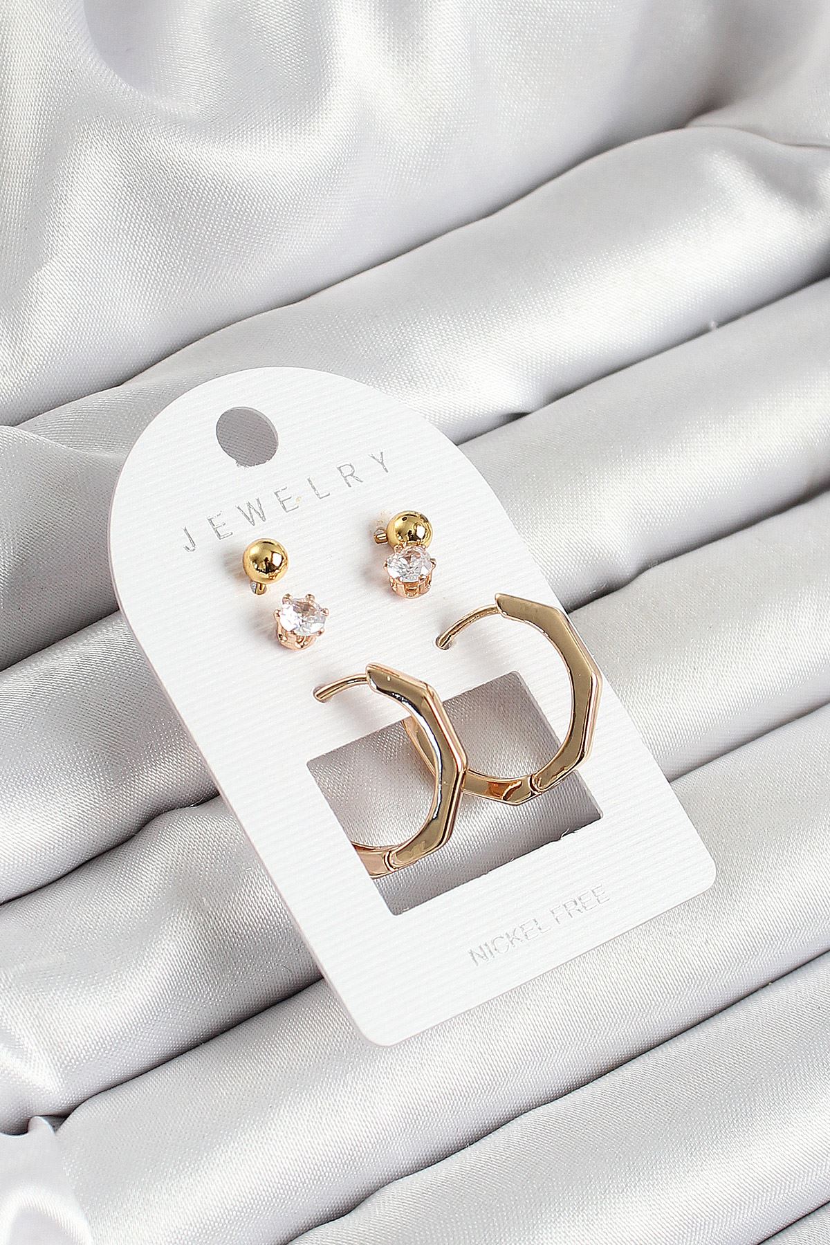 Pirinç Zirkon Taş Ve Kemik Halka Figürlü Gold Renk 3'lü Çift Kadın Küpe Set - TJ-BKP10654