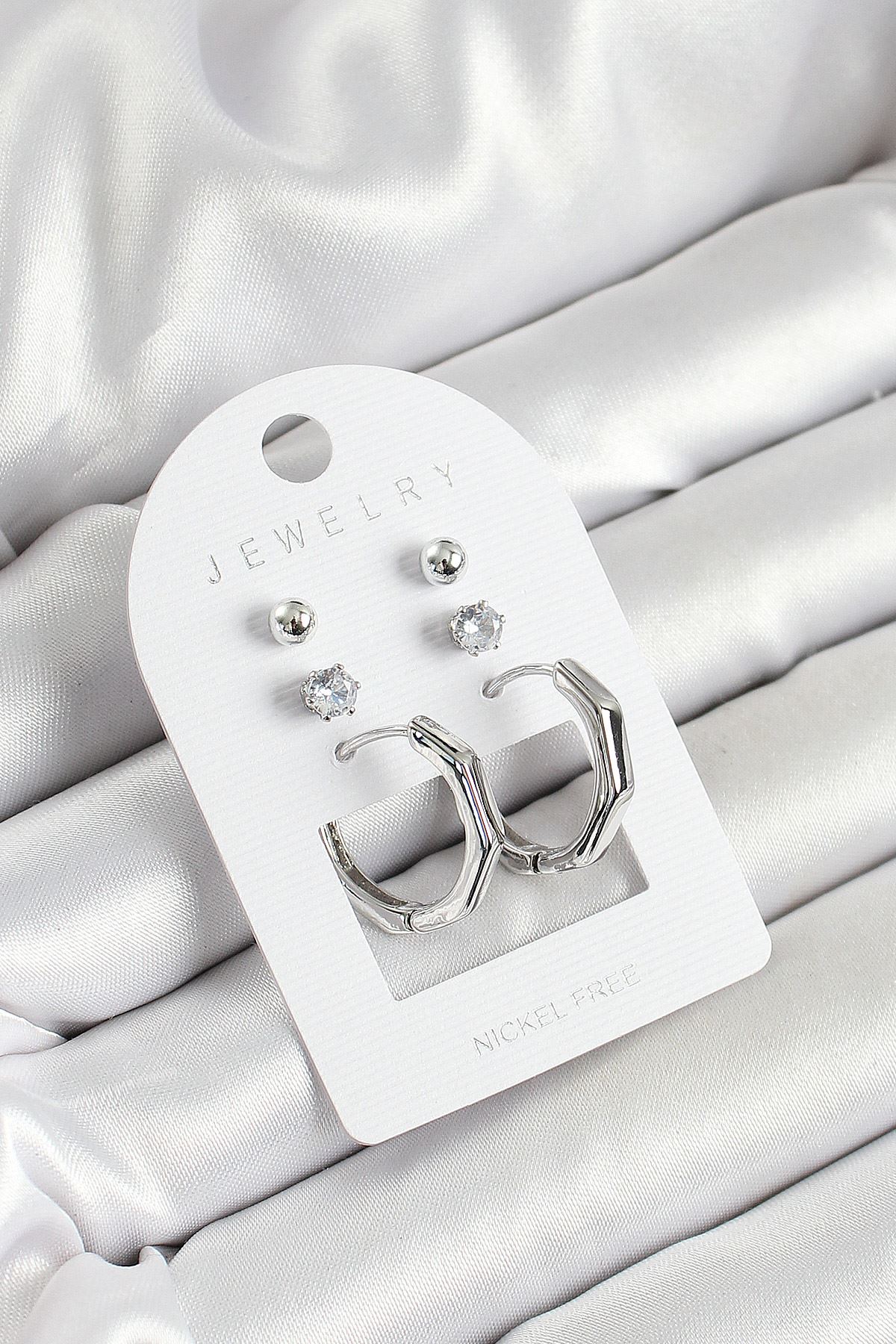 Pirinç Zirkon Taş Ve Kemik Halka Figürlü Gümüş Renk 3'lü Çift Kadın Küpe Set - TJ-BKP10648