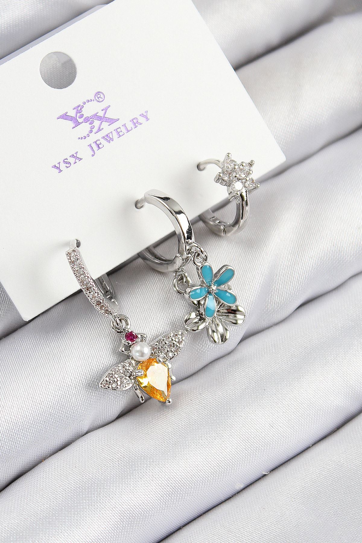 Pirinç Zirkon Taşlı 3'lü Arı Ve Çiçek Model Gümüş Renk Kadın Küpe - TJ-BKP11126