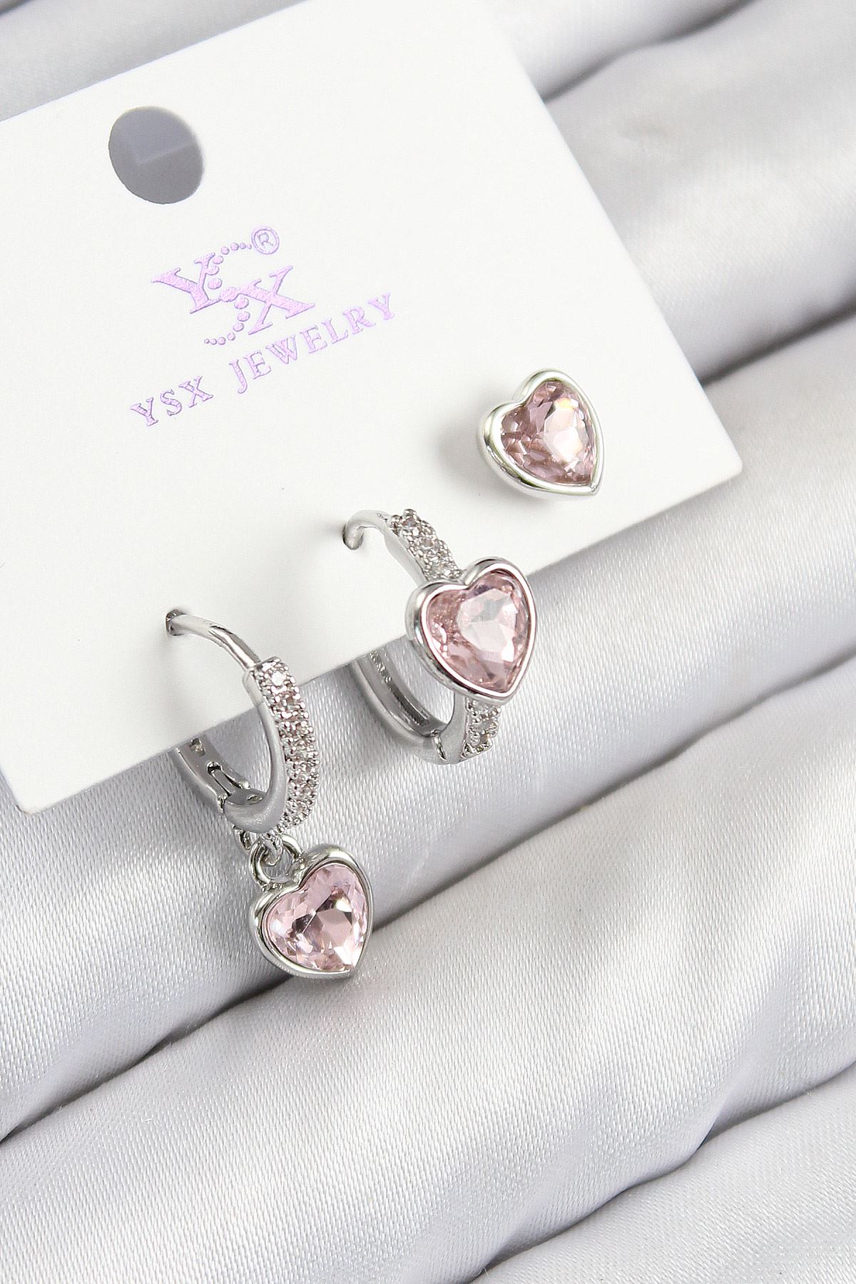 Pirinç Zirkon Taşlı 3'lü Pembe Kalp Model Gümüş Renk Kadın Küpe - TJ-BKP11128