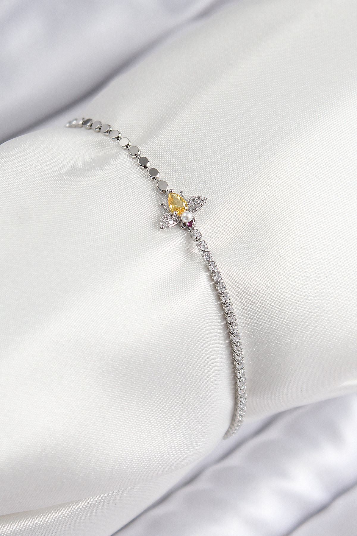 Pirinç Zirkon Taşlı Arı Model Ezme Zincir Gümüş Renk Kadın Bileklik - TJ-BB7596