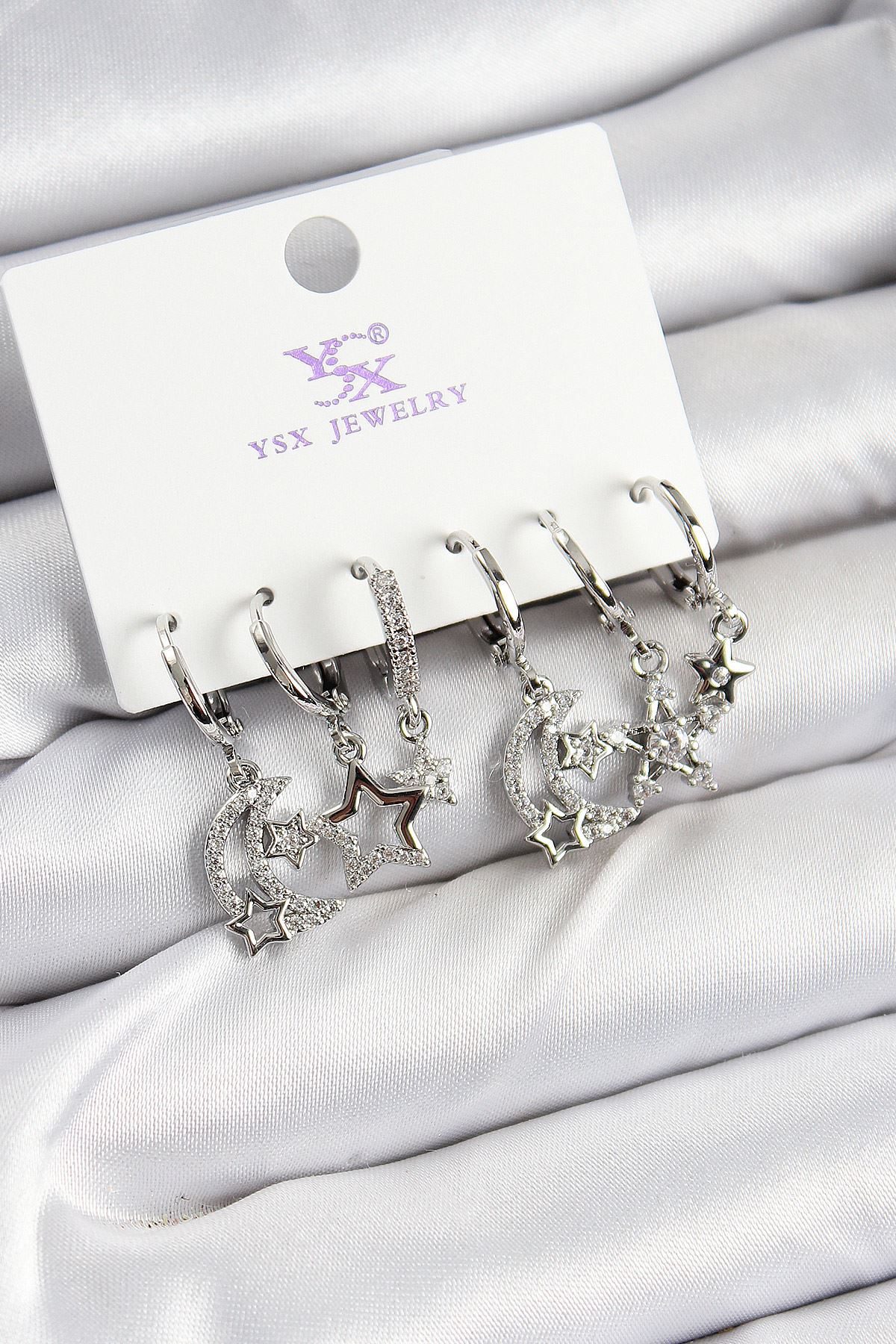Pirinç Zİrkon Taşlı Ay ve Yıldız Model Gümüş Renk 3'lü Çift Kadın Küpe - TJ-BKP10952