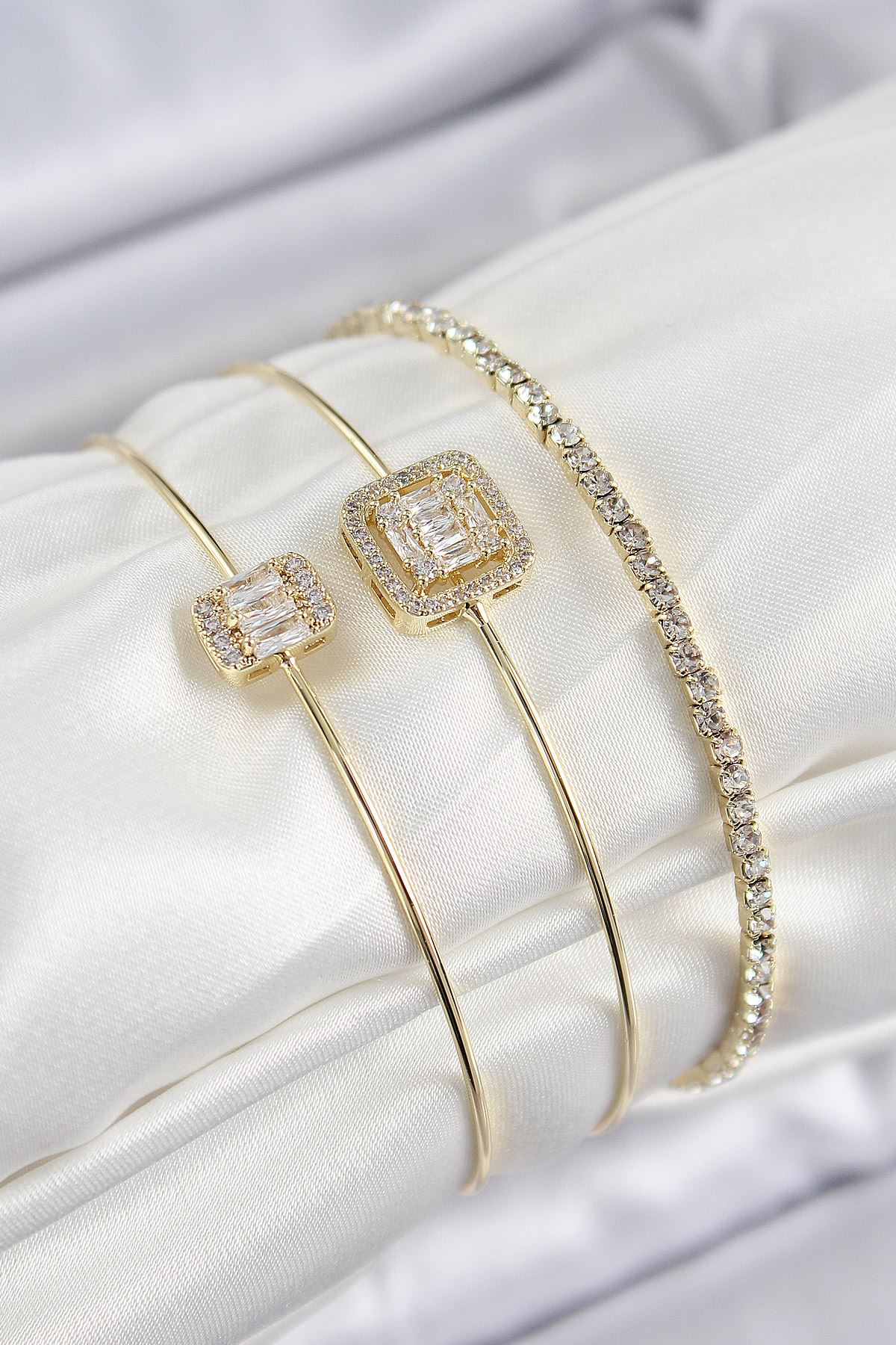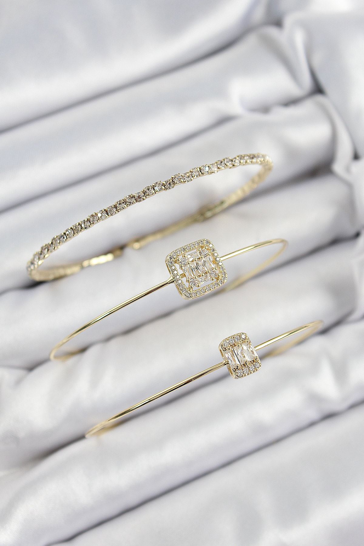 Pirinç Zirkon Taşlı Baget Model Gold Renk Vip 3'lü Kadın Bileklik - TJ-BB7334