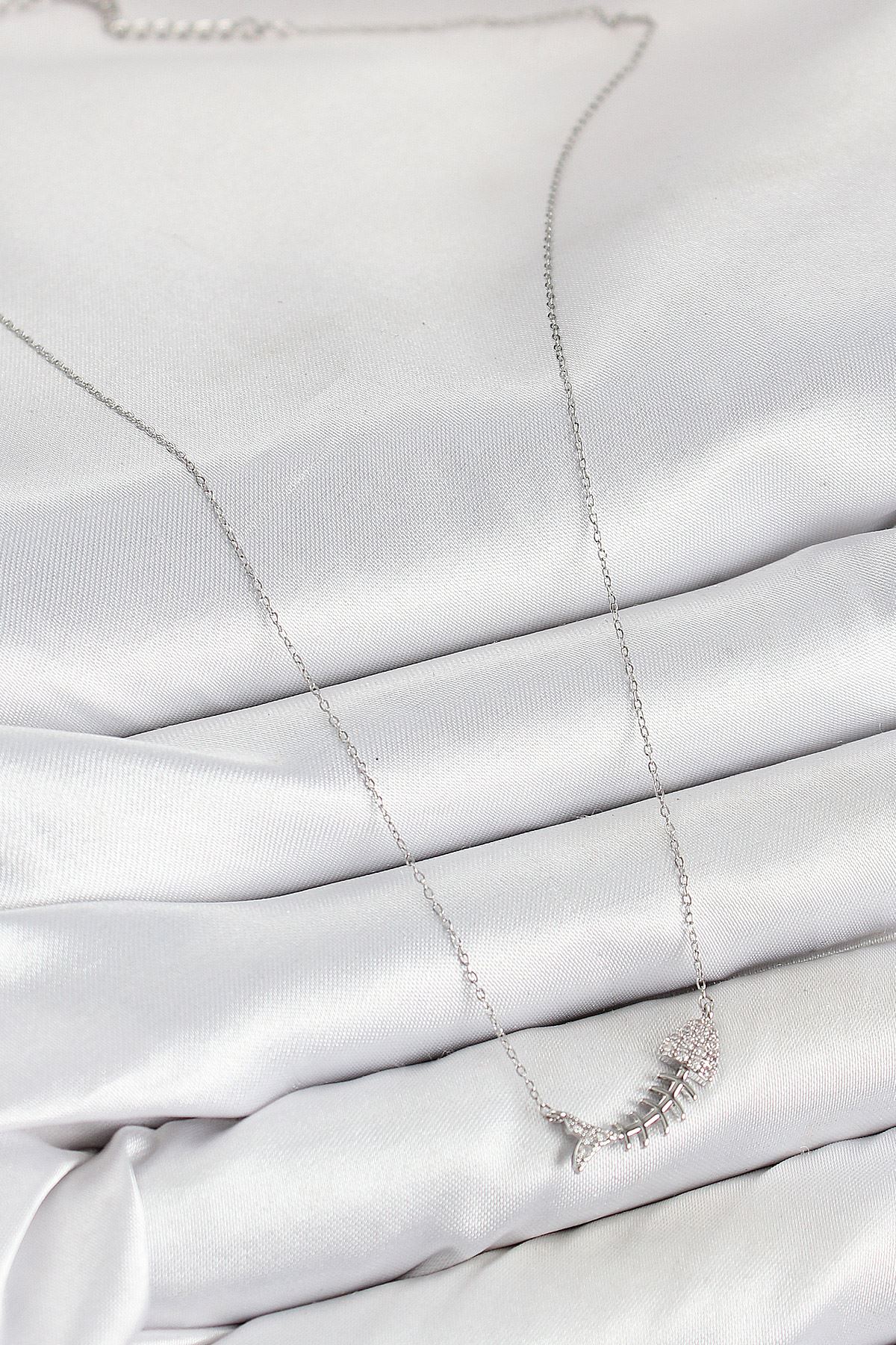 Pirinç Zirkon Taşlı Balık Kılçığı Model Gümüş Renk Kadın Kolye - TJ-BKO10413