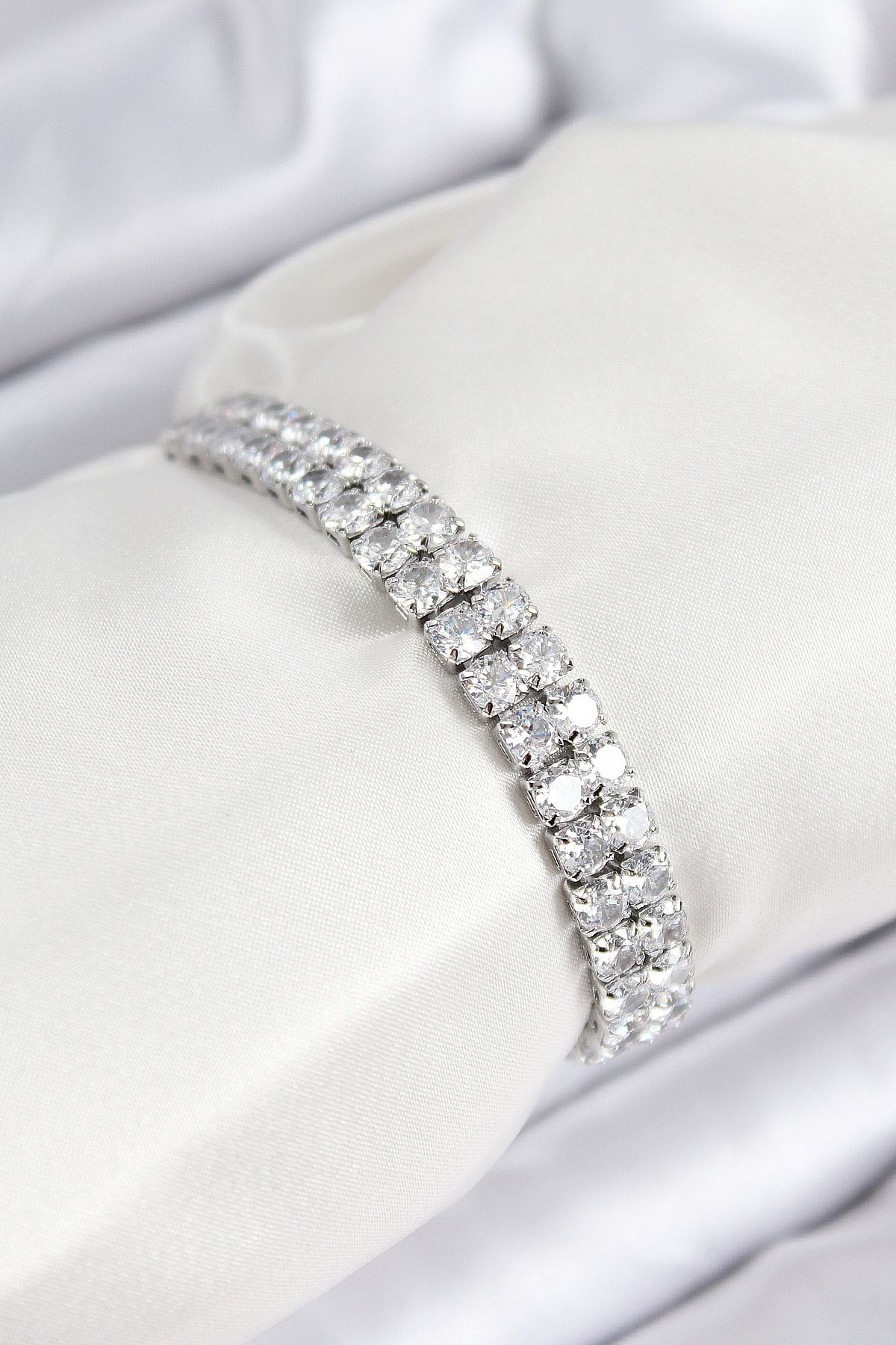Pirinç Zirkon Taşlı Çift Sıra Kare Model Gümüş Renk Asansörlü Kadın Bileklik - TJ-BB7730