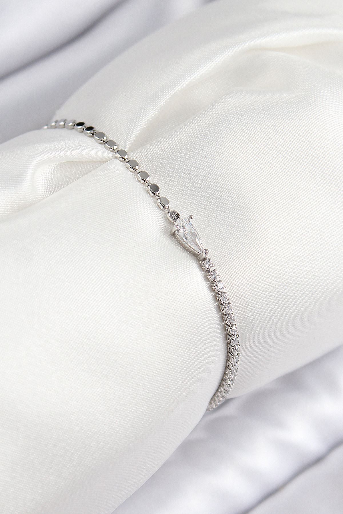 Pirinç Zirkon Taşlı Damla Model Ezme Zincir Gümüş Renk Kadın Bileklik - TJ-BB7590