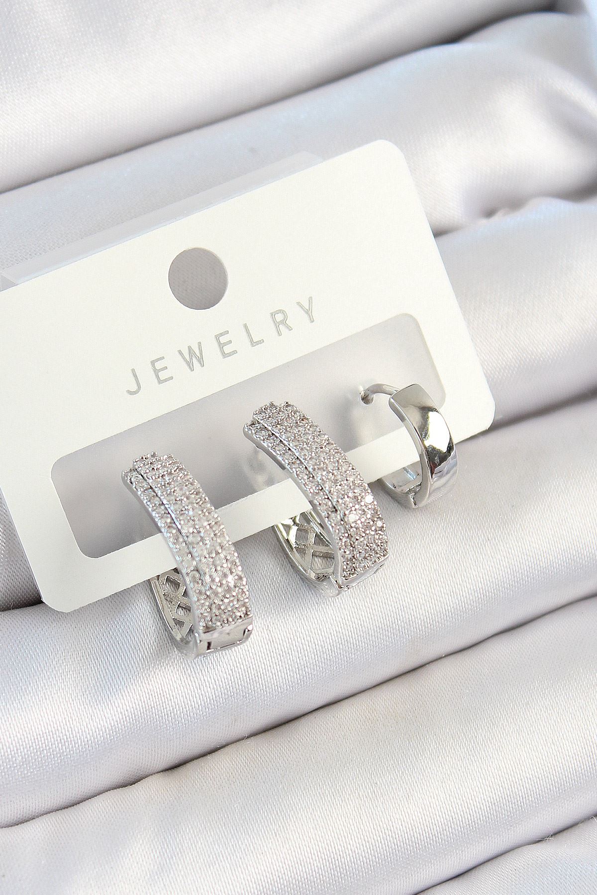 Pirinç Zirkon Taşlı Halka Model Gümüş Renk 3'lü Çift Kadın Küpe Set - TJ-BKP10800