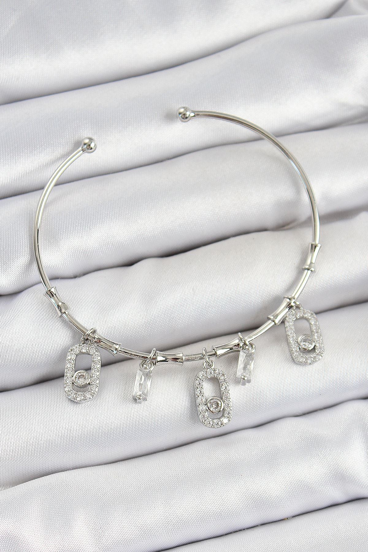 Pirinç Zirkon Taşlı Dikdörtgen Model Gümüş Renk Charm Bileklik - TJ-BB7351