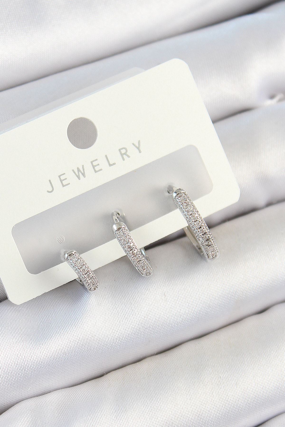 Pirinç Zirkon Taşlı Halka Model Gümüş Renk 3'lü Çift Kadın Küpe Set - TJ-BKP10793
