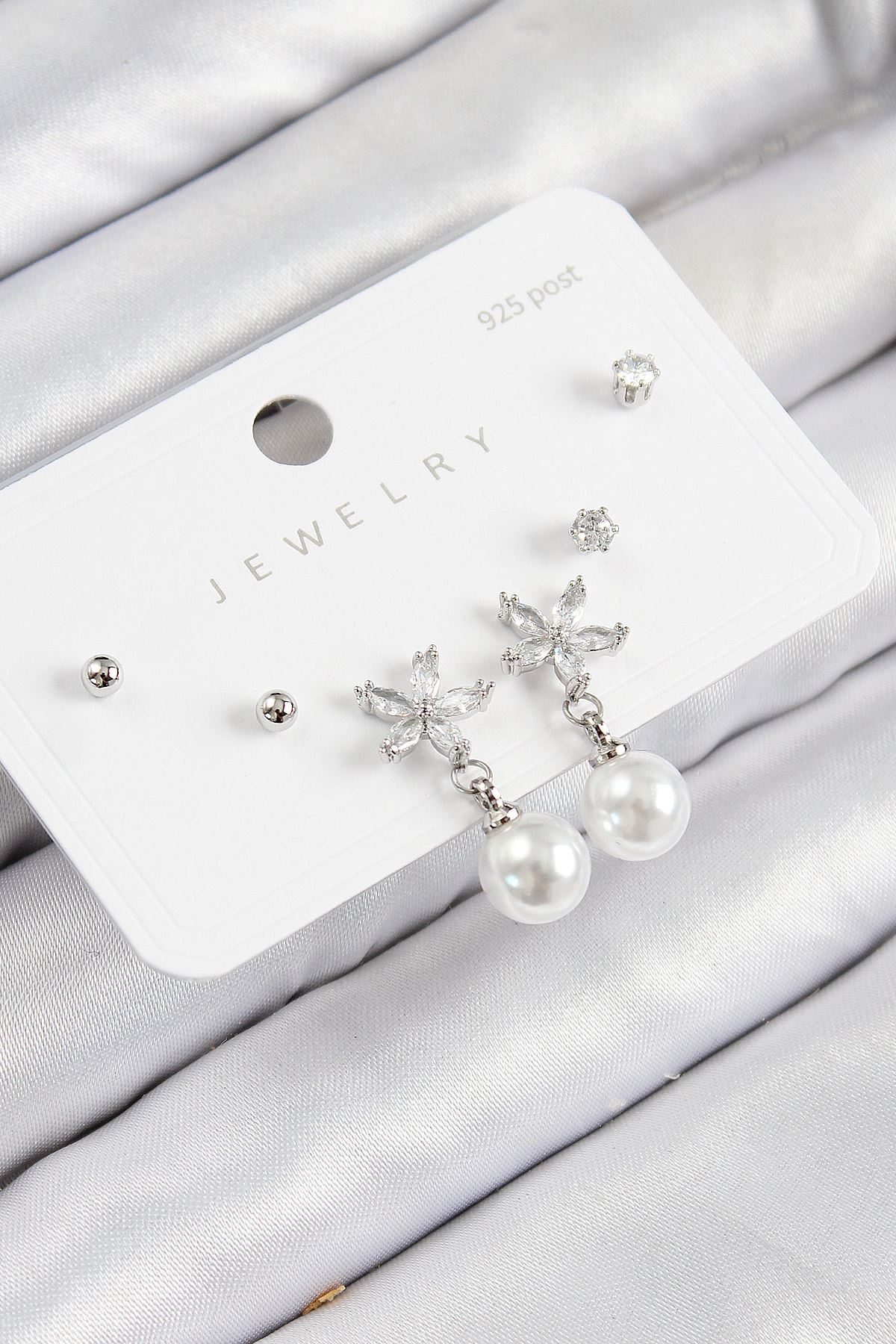 Pirinç Zirkon Taşlı İnci Sallantılı Çiçek Model Gümüş Renk 925 Ayar Gümüş Çivi Kadın Küpe Set - TJ-BKP11175