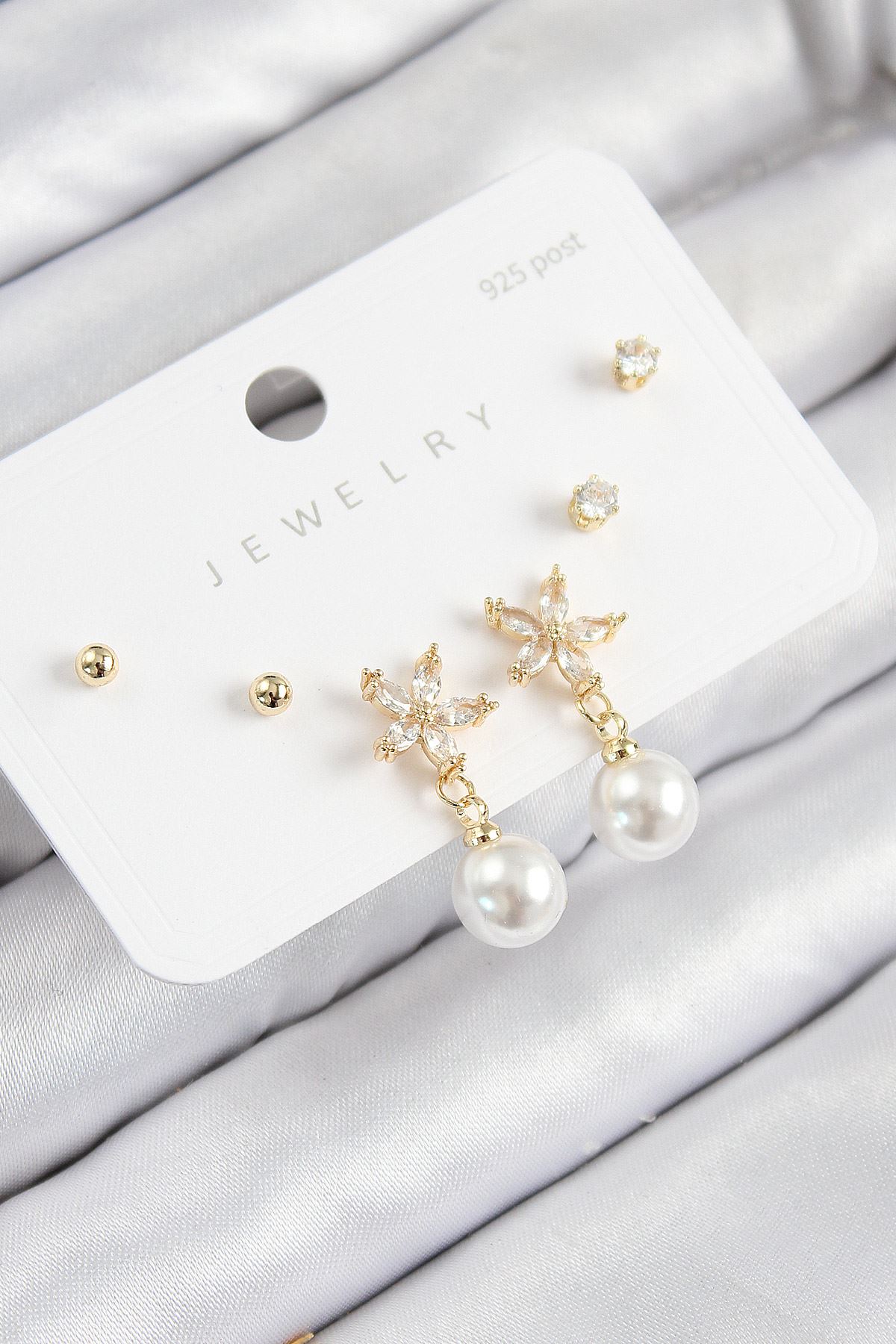 Pirinç Zirkon Taşlı İnci Sallantılı Çiçek Model Gümüş Renk 925 Ayar Gümüş Çivi Kadın Küpe Set - TJ-BKP11176