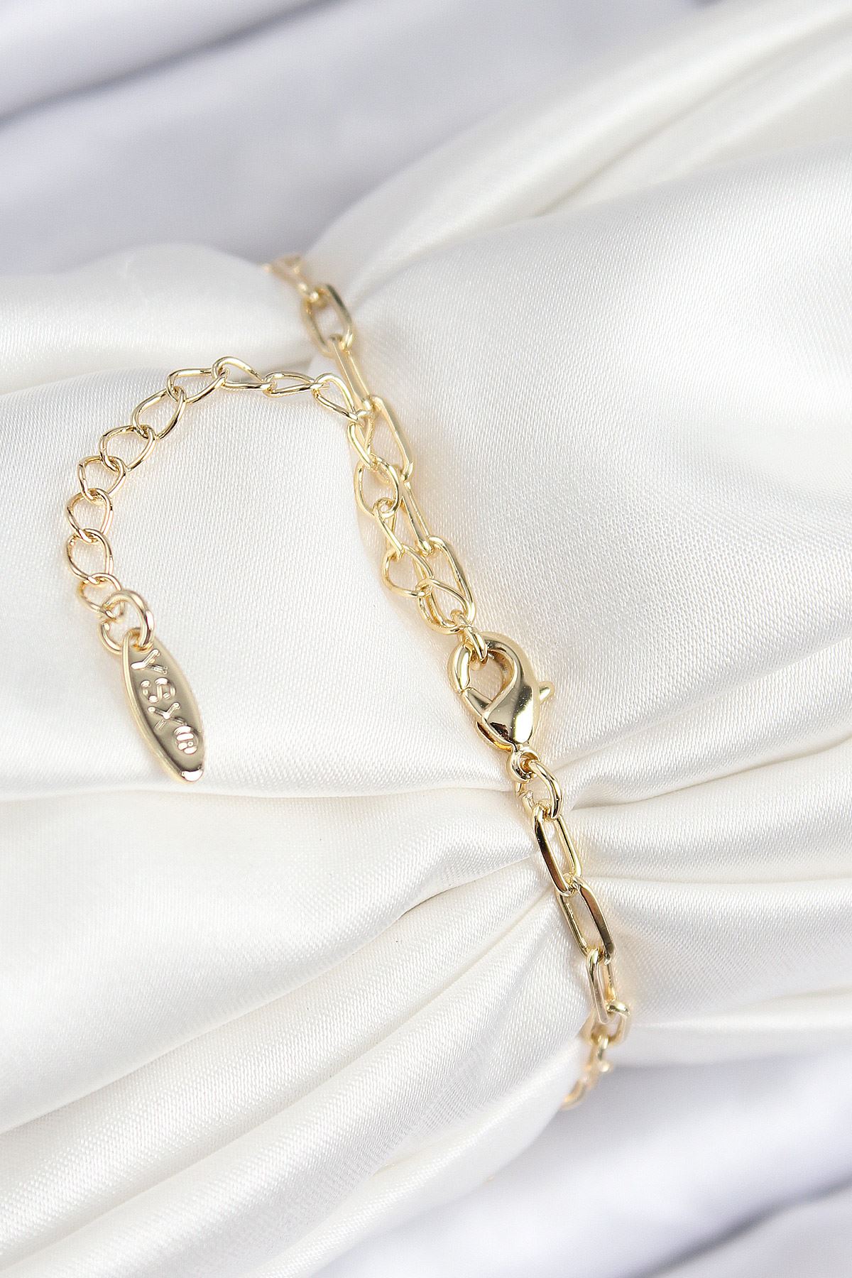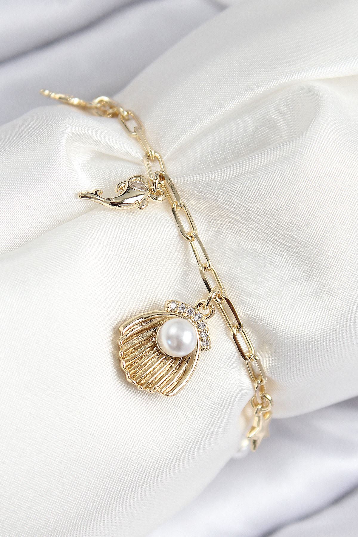 Pirinç Zirkon Taşlı İncili İstiridye Model Gold Renk Kadın Bileklik - TJ-BB7774