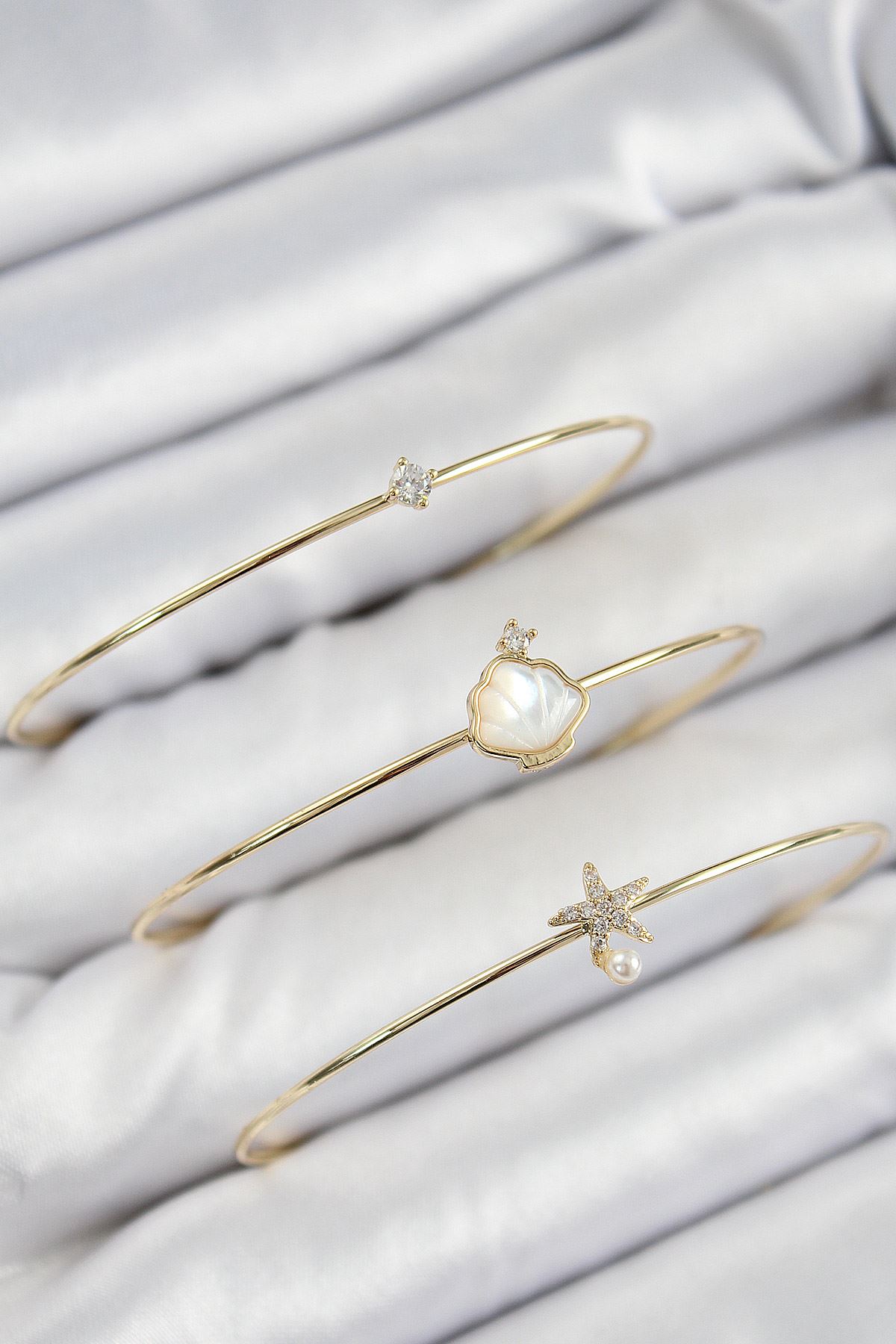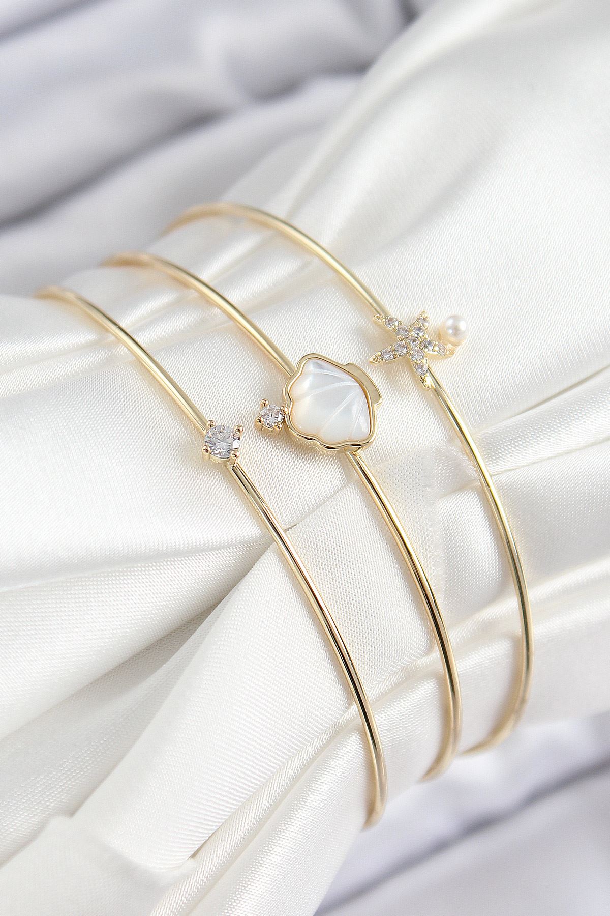 Pirinç Zirkon Taşlı İstiridye Ve Deniz Yıldızı Model Gold Renk Vip 3'lü Kadın Bileklik - TJ-BB7335