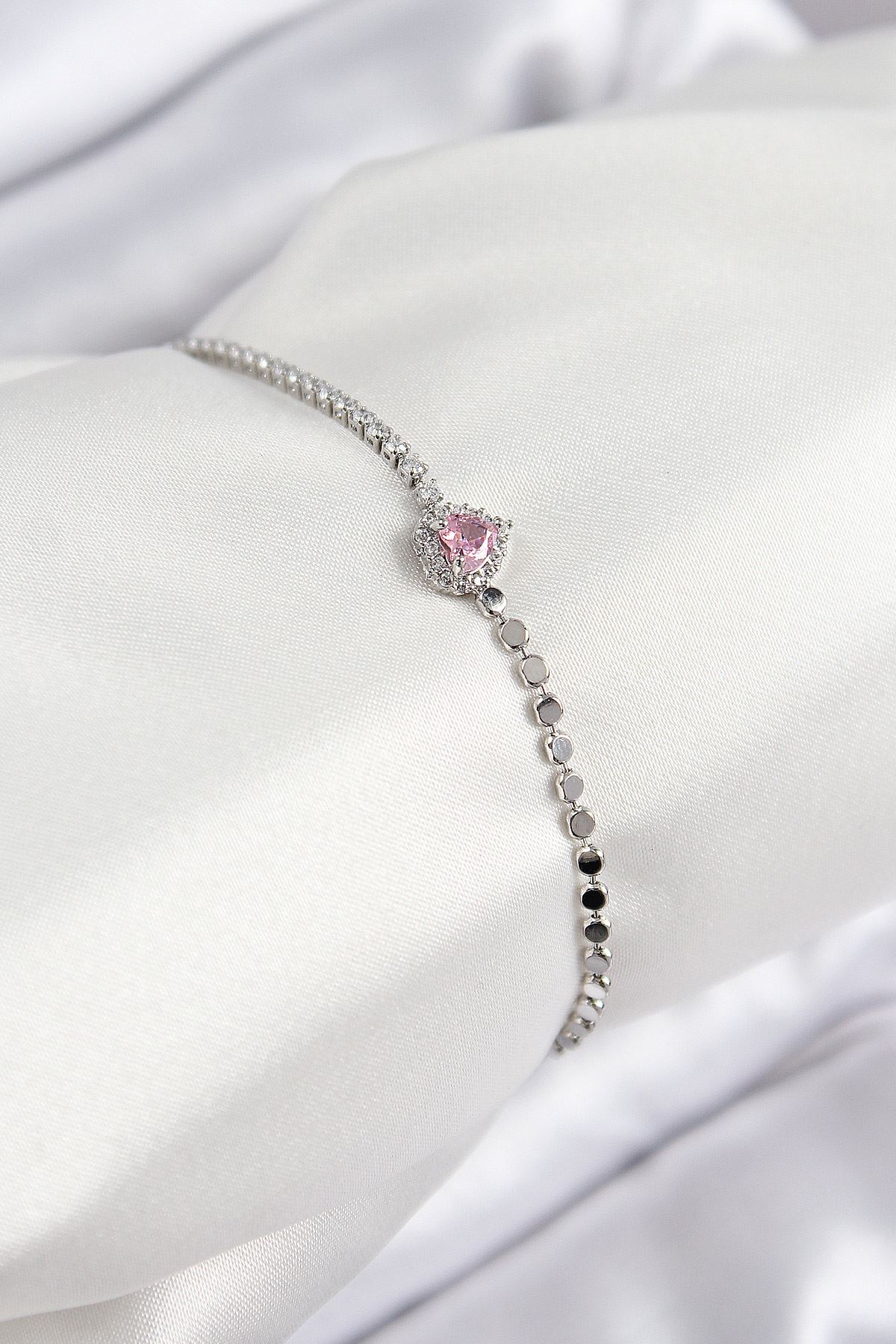 Pirinç Zirkon Taşlı Kalp Model Ezme Zincir Gümüş Renk Kadın Bileklik - TJ-BB7586