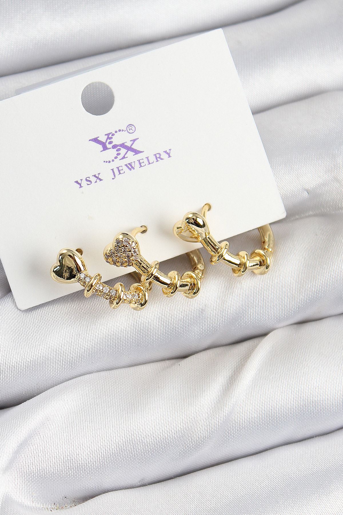 Pirinç Zİrkon Taşlı Kalp Model Gold Renk 3'lü Kadın Küpe - TJ-BKP10947
