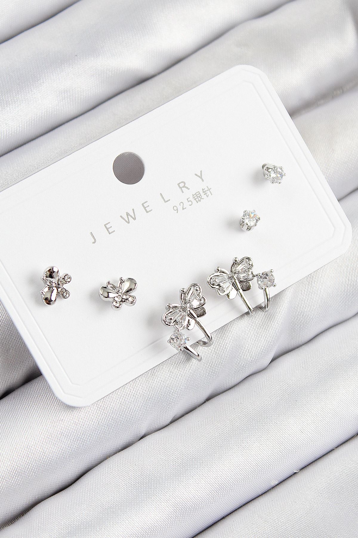 Pirinç Zirkon Taşlı Kelebek Model Gümüş Renk 925 Ayar Gümüş Çivi Kadın Küpe Set - TJ-BKP11163