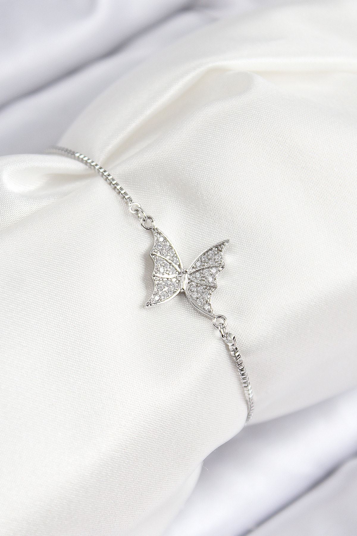 Pirinç Zirkon Taşlı Kelebek Model Gümüş Renk Asansörlü Kadın Bileklik - TJ-BB7724