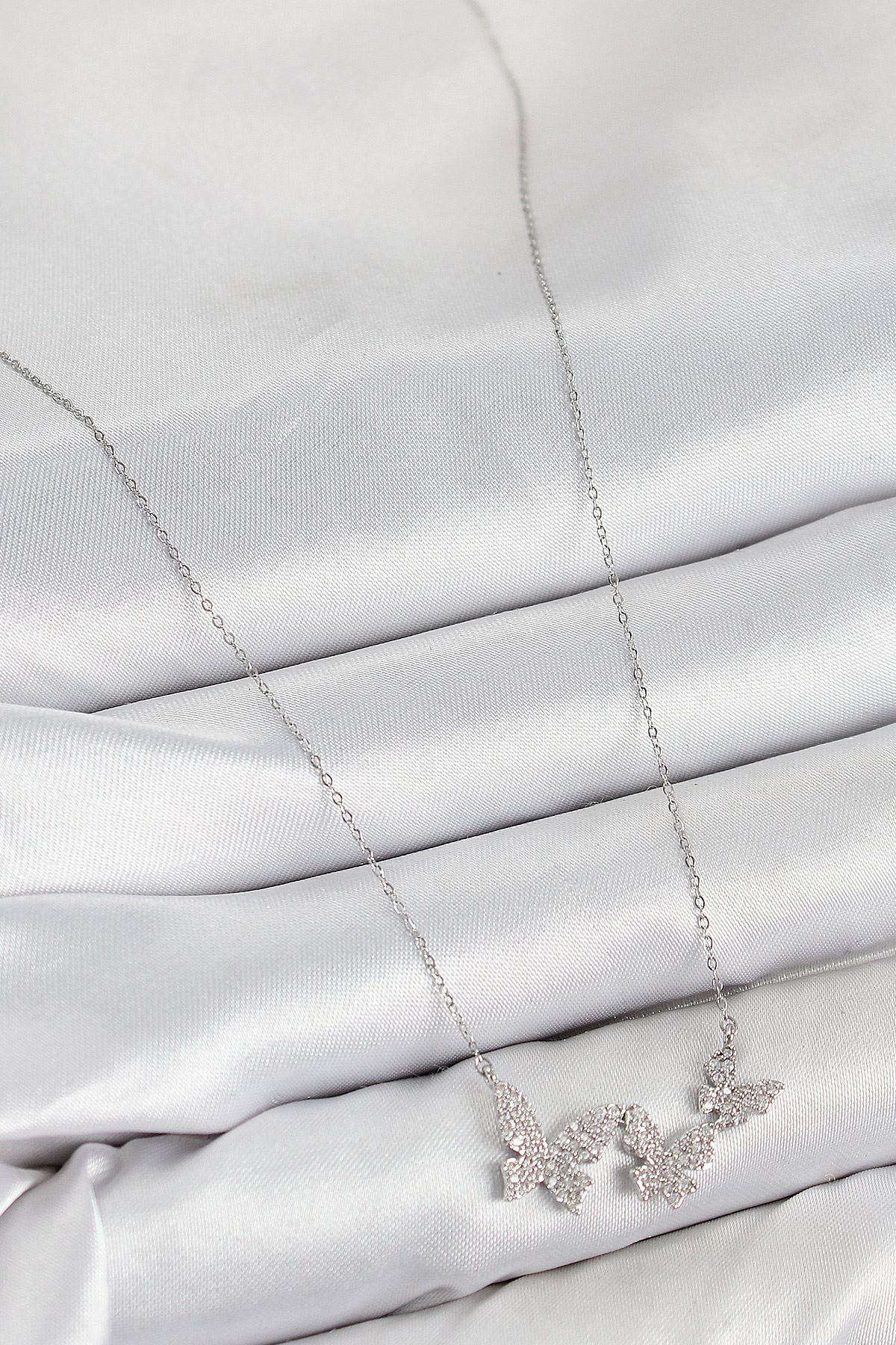 Pirinç Zirkon Taşlı Kelebek Model Gümüş Renk Kadın Kolye - TJ-BKO10425