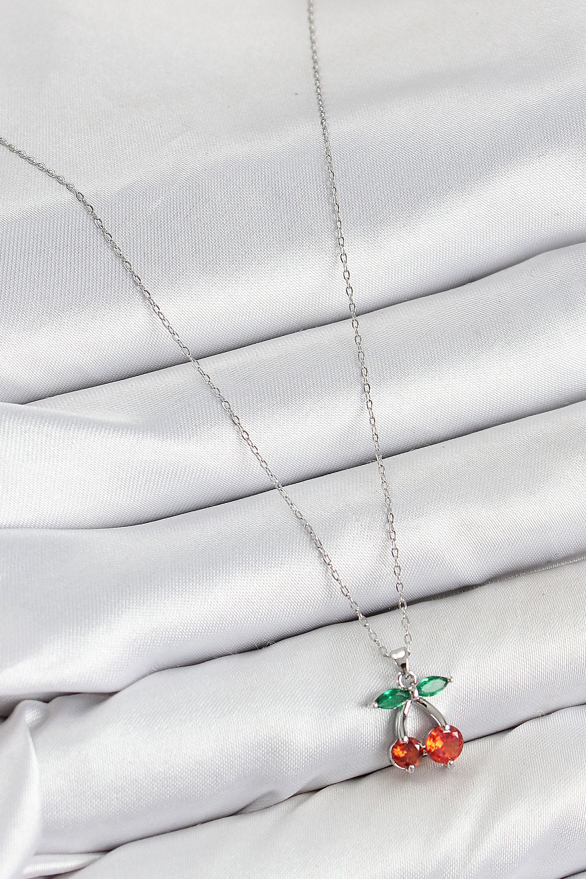Pirinç Zirkon Taşlı Kiraz Model Gümüş Renk Kadın Kolye - TJ-BKO10421