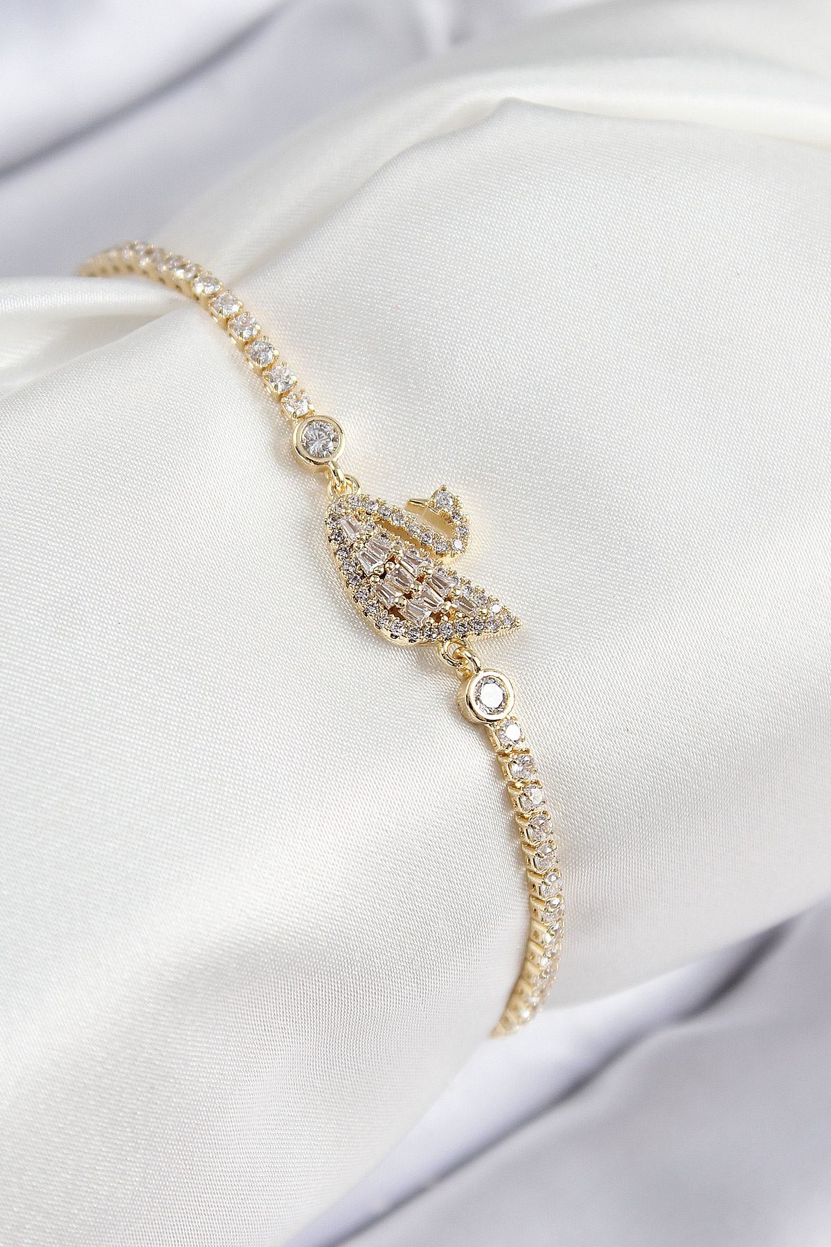 Pirinç Zirkon Taşlı Kuğu Model Gold Renk Kadın Bileklik - TJ-BB7691
