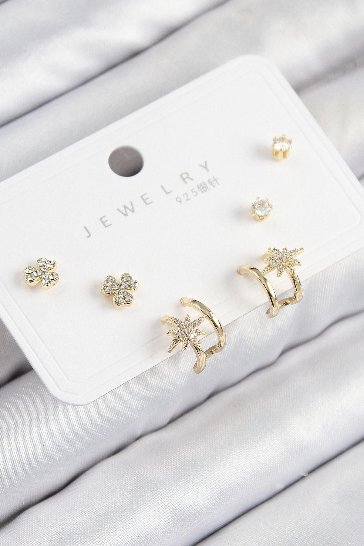 Pirinç Zirkon Taşlı Kutup Yıldızı Model Gold Renk 925 Ayar Gümüş Çivi Kadın Küpe Set - TJ-BKP11168