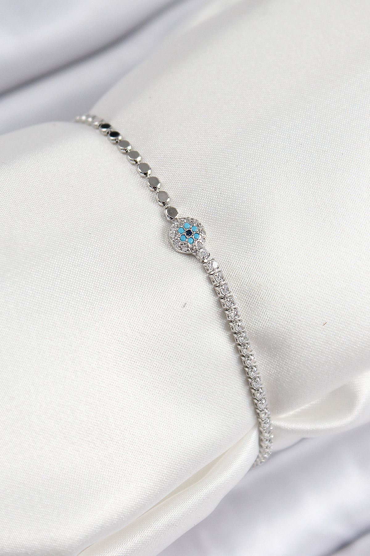 Pirinç Zirkon Taşlı Nazar Model Ezme Zincir Gümüş Renk Kadın Bileklik - TJ-BB7584