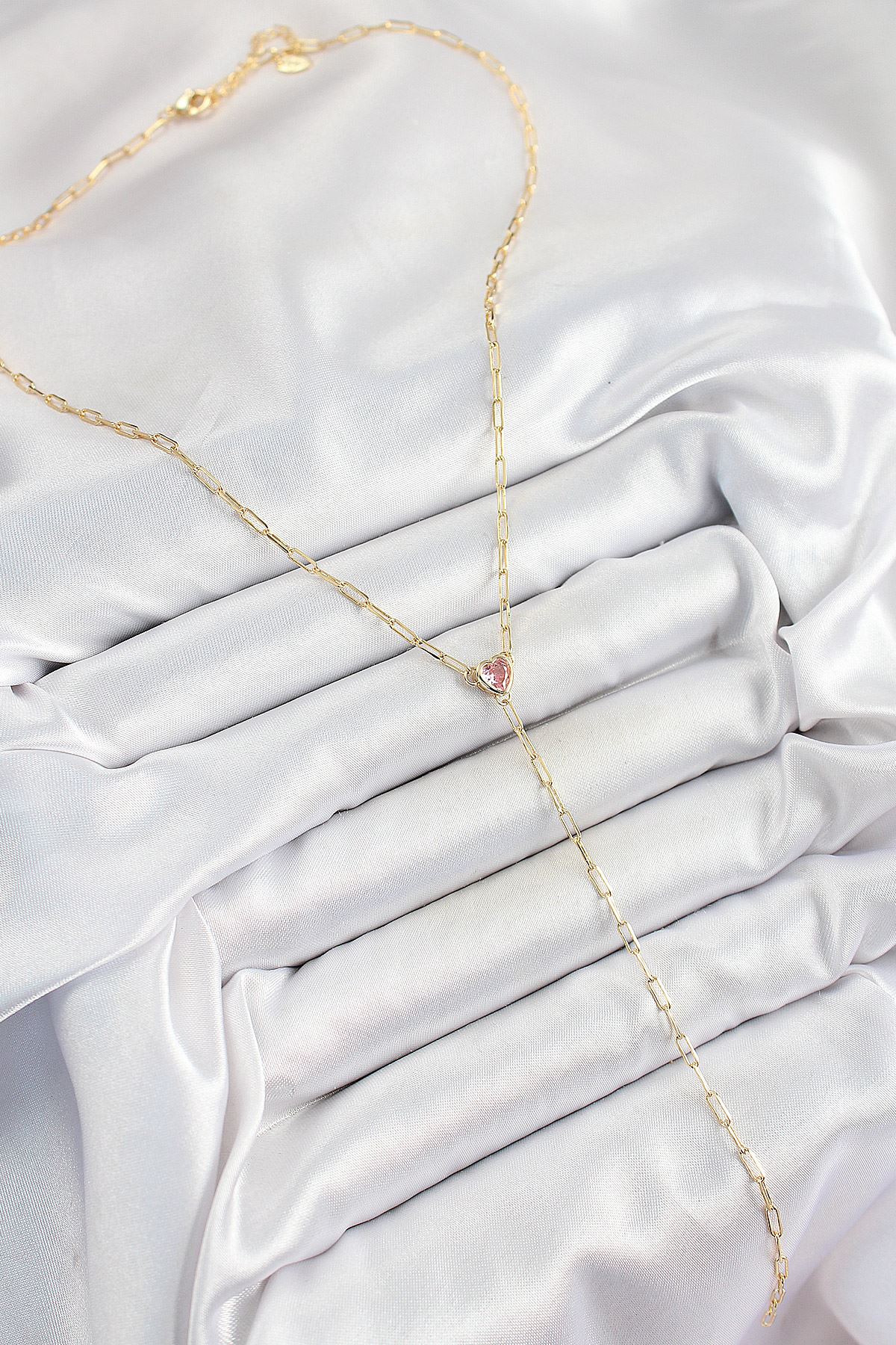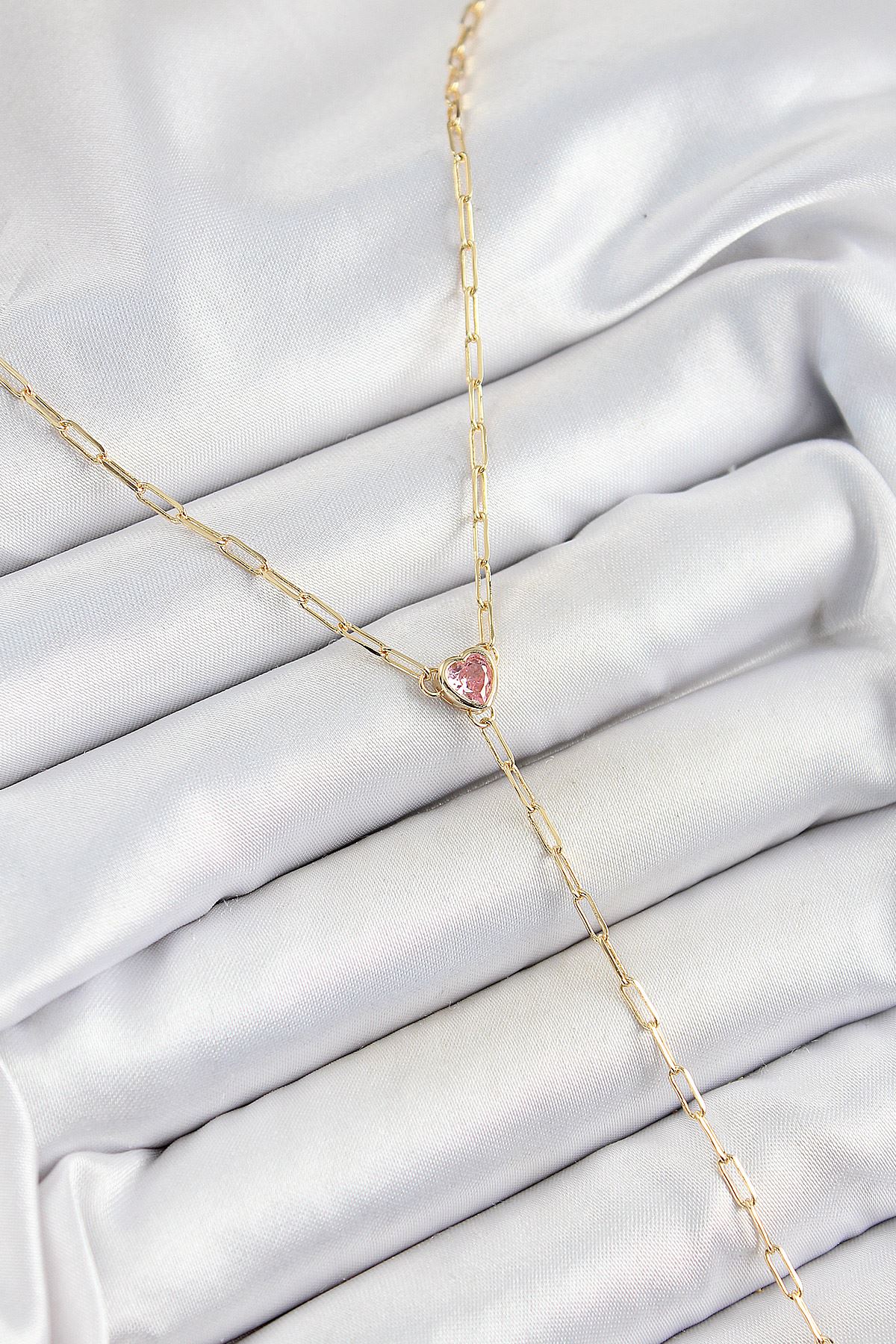 Pirinç Zirkon Taşlı Pembe Kalp Figürlü Y Model Gold Renk Kadın Kolye - TJ-BKO10320