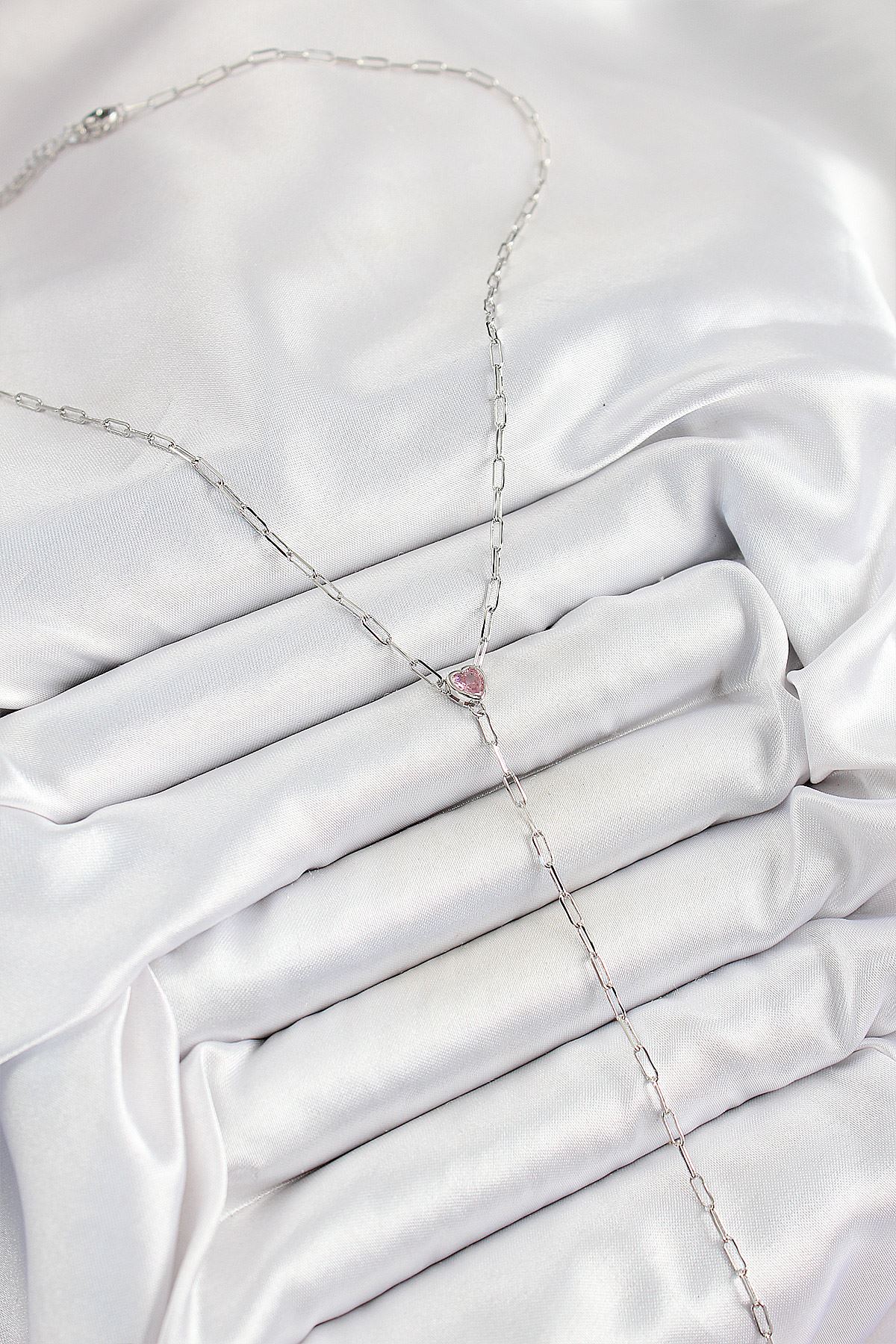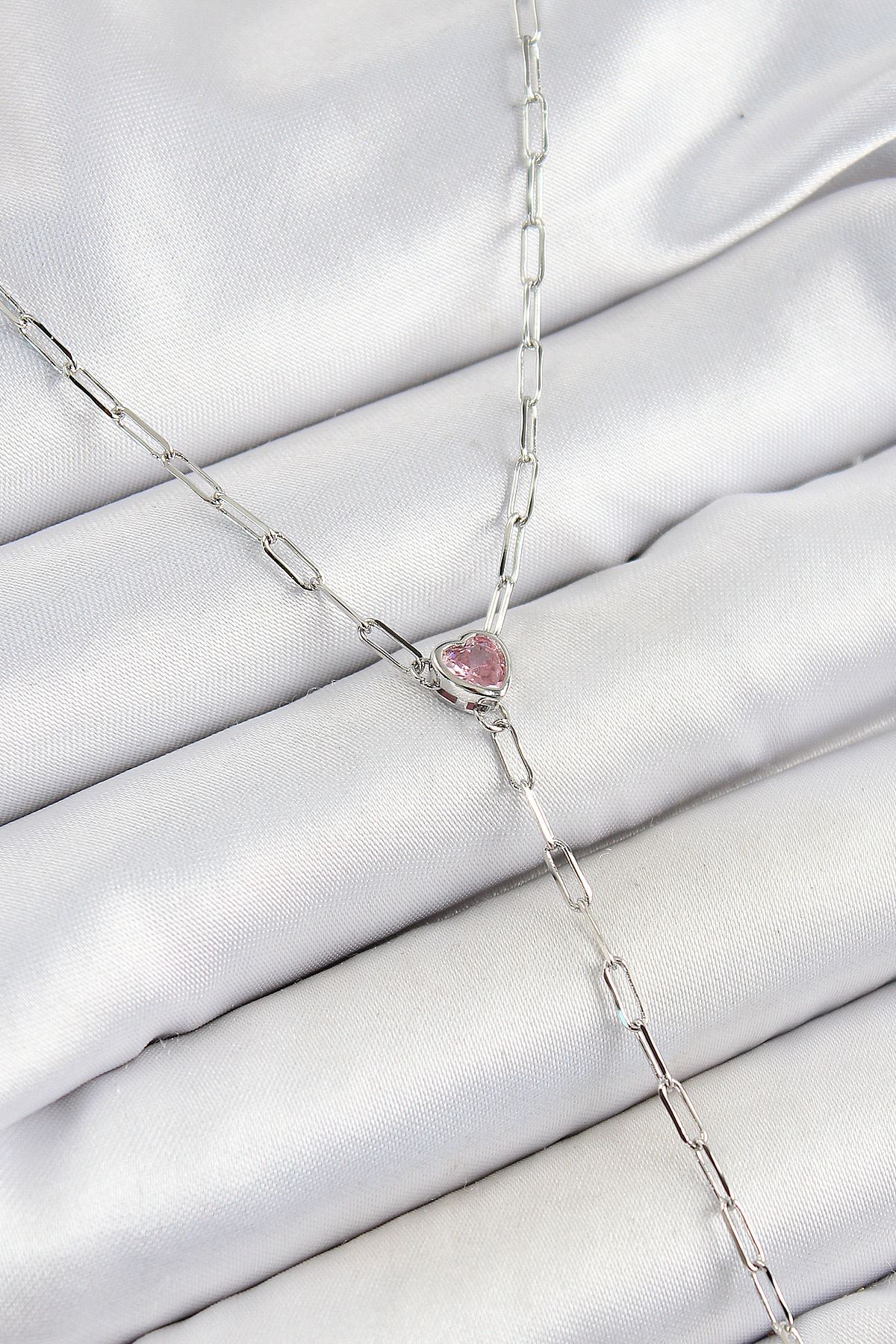 Pirinç Zirkon Taşlı Pembe Kalp Figürlü Y Model Gümüş Renk Kadın Kolye - TJ-BKO10319