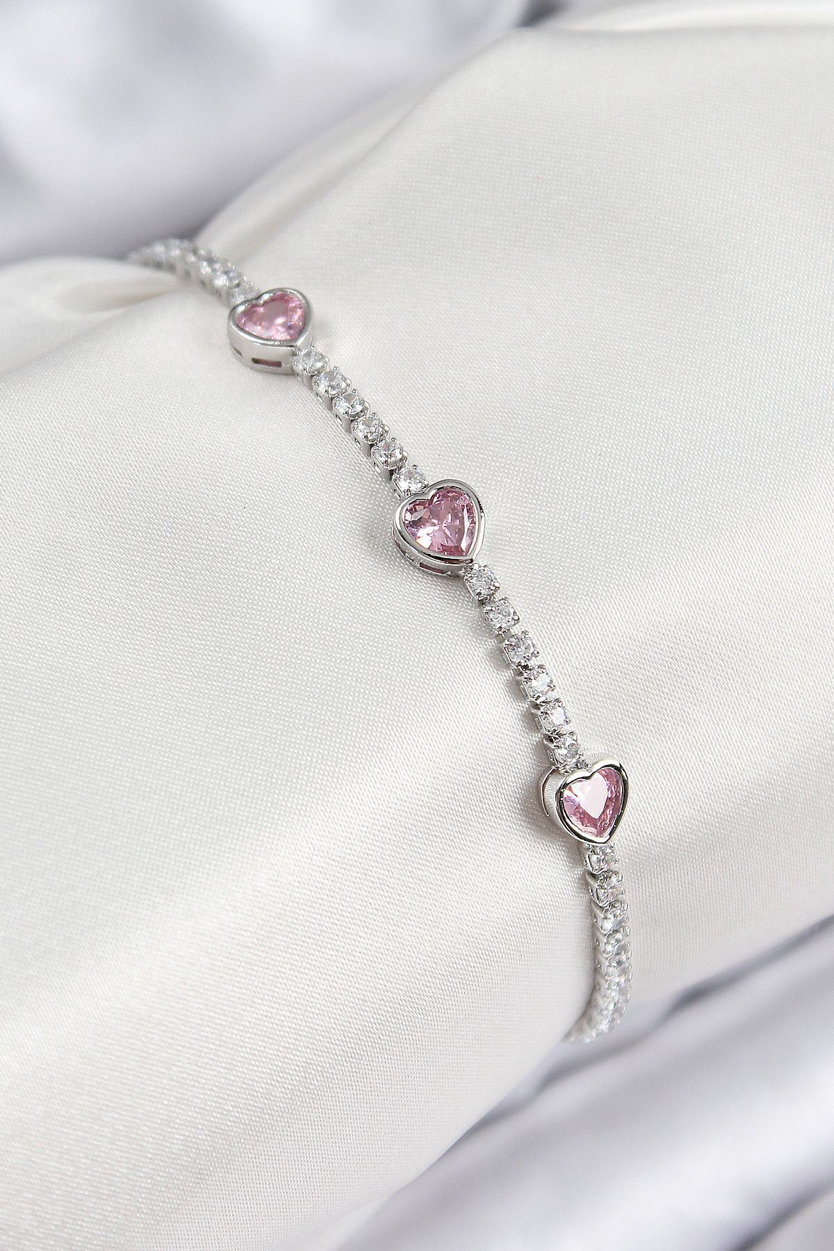 Pirinç Zirkon Taşlı Pembe Kalp Model Gümüş Renk Kadın Bileklik - TJ-BB7686