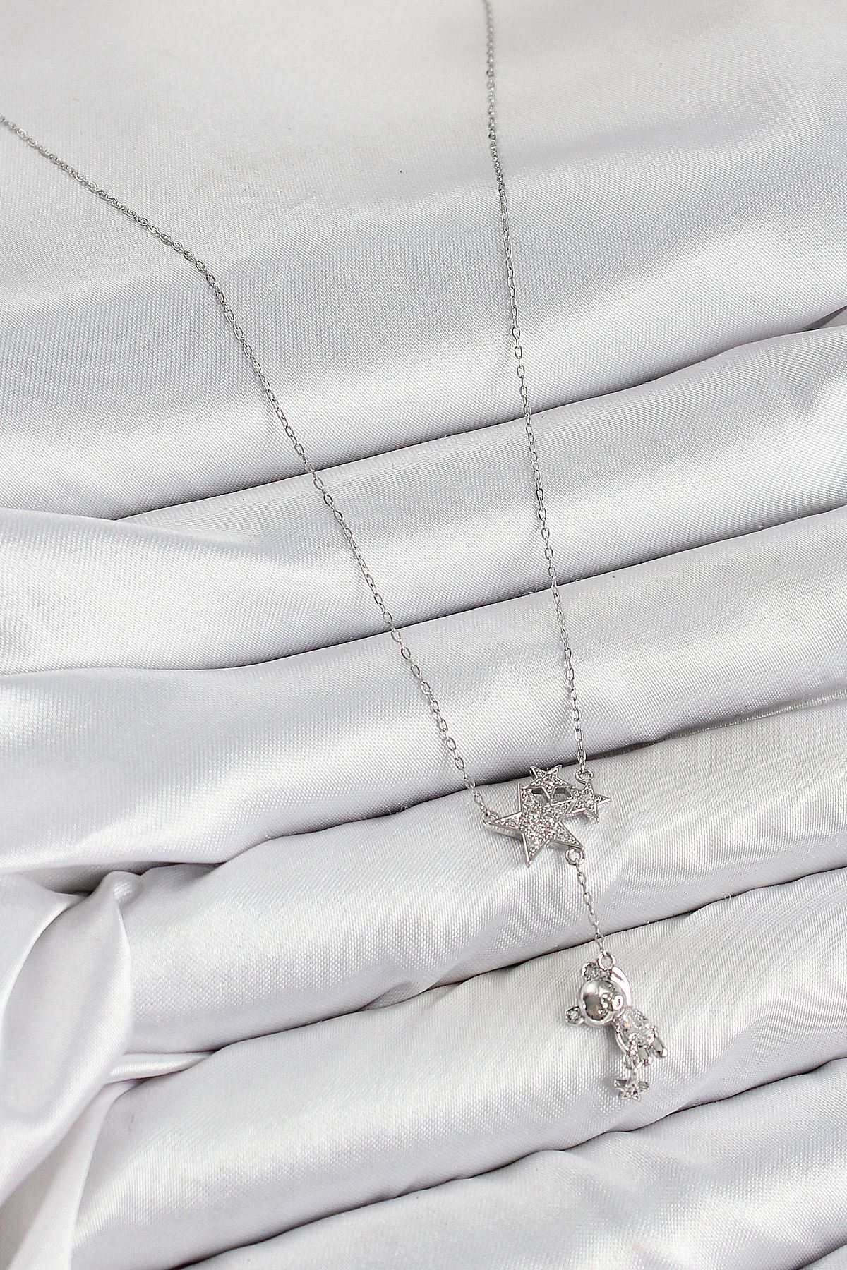Pirinç Zirkon Taşlı Sallantılı Ayıcıklı Yıldız Model Gümüş Renk Kadın Kolye - TJ-BKO10419