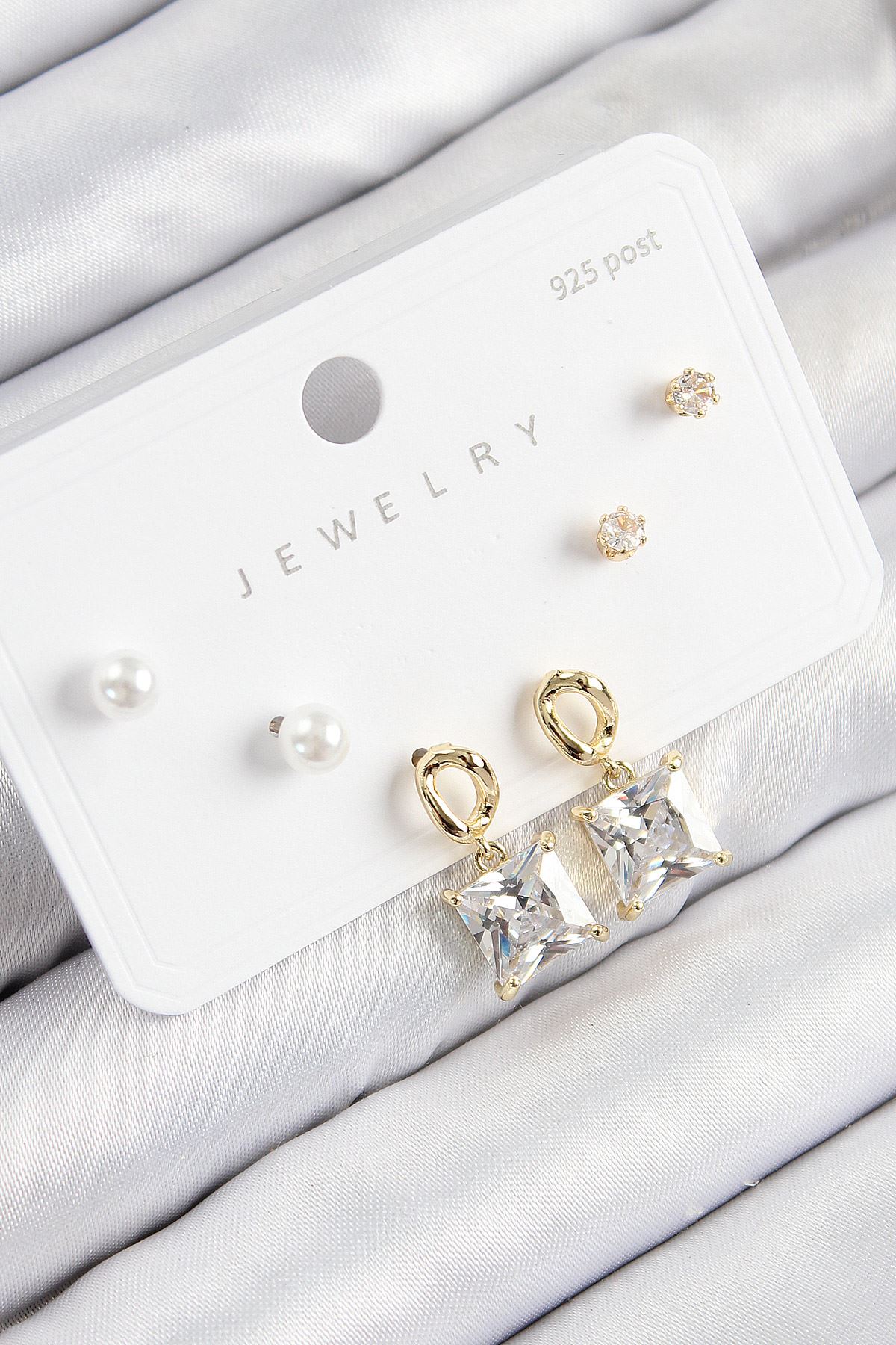 Pirinç Zirkon Taşlı Sallantılı Kare Model Gold Renk 925 Ayar Gümüş Çivi Kadın Küpe Set - TJ-BKP11162