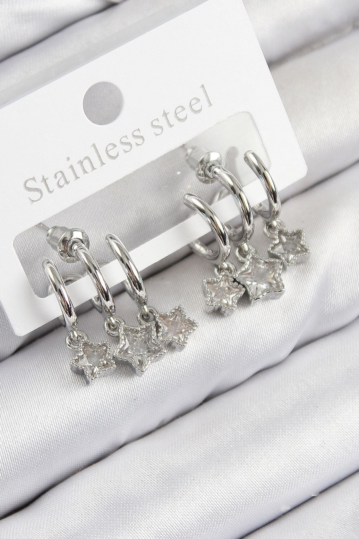 Pirinç Zirkon Taşlı Sallantılı Yıldız Model Gümüş Renk Kadın Küpe - TJ-BKP11116