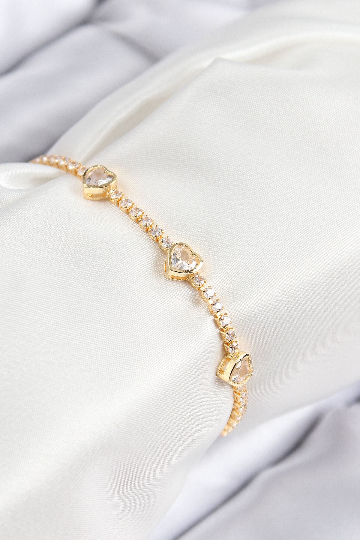 Pirinç Zirkon Taşlı Sıralı Kalp Model Gold Renk Kadın Bileklik - TJ-BB7729