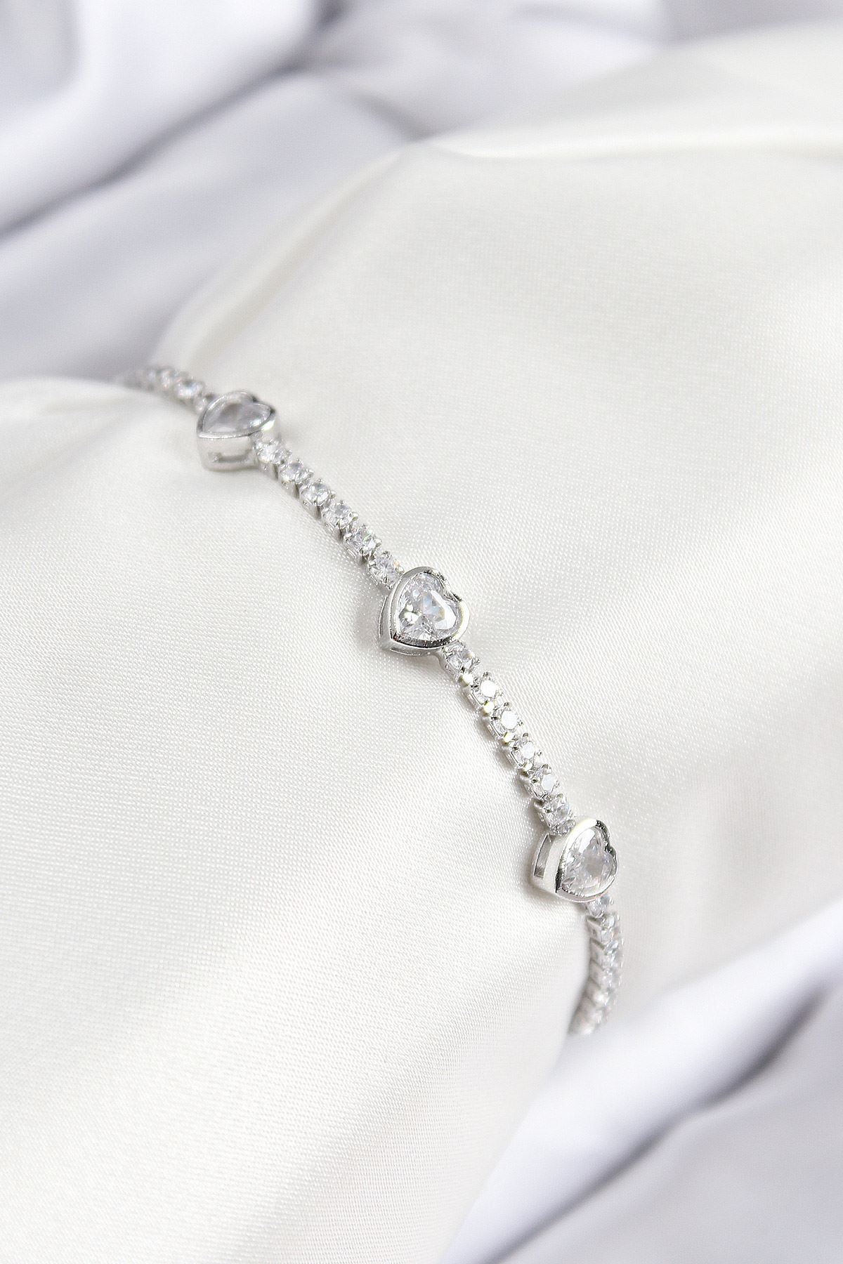 Pirinç Zirkon Taşlı Sıralı Kalp Model Gümüş Renk Asansörlü Kadın Bileklik - TJ-BB7728
