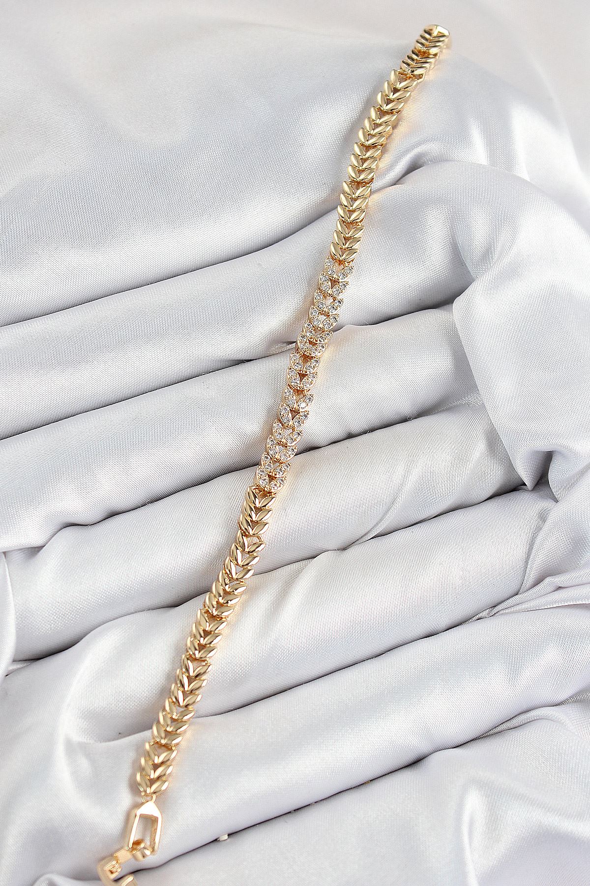 Pirinç Zirkon Taşlı Sıralı Yaprak Model Gold Renk Kadın Bileklik - TJ-BB7531