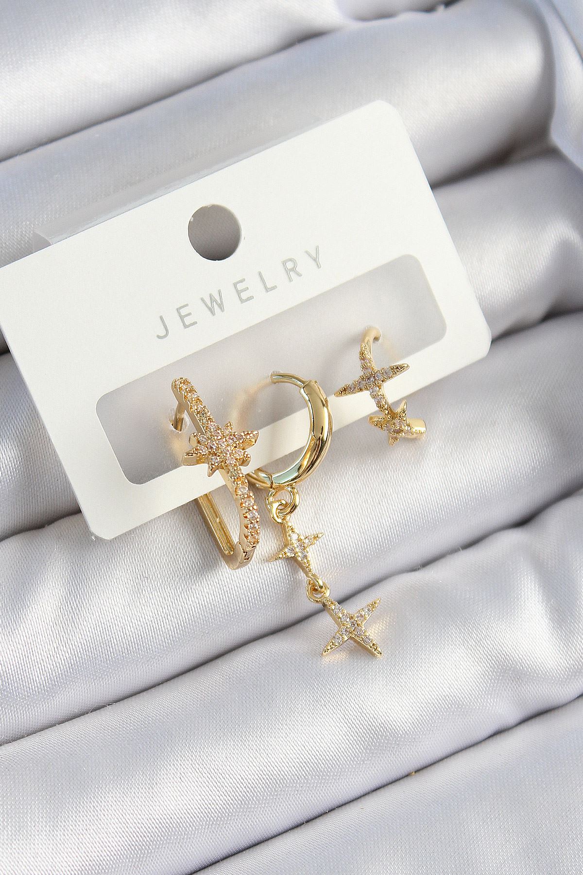 Pirinç Zirkon Taşlı Yıldız Model Gold Renk 3'lü Çift Kadın Küpe Set - TJ-BKP10837