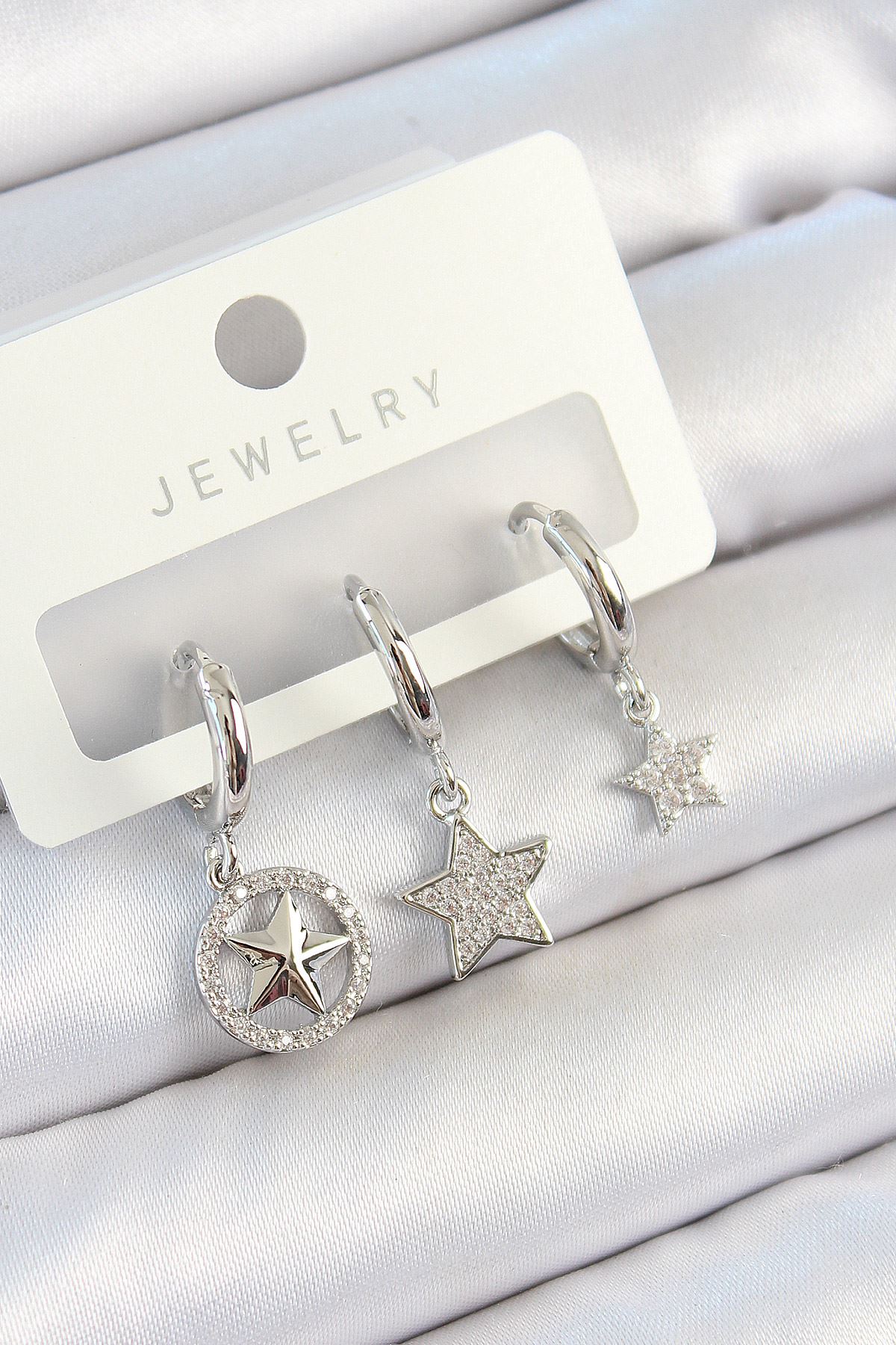 Pirinç Zirkon Taşlı Sallantılı Yıldız Model Gümüş Renk 3'lü Çift Kadın Küpe Set - TJ-BKP10792