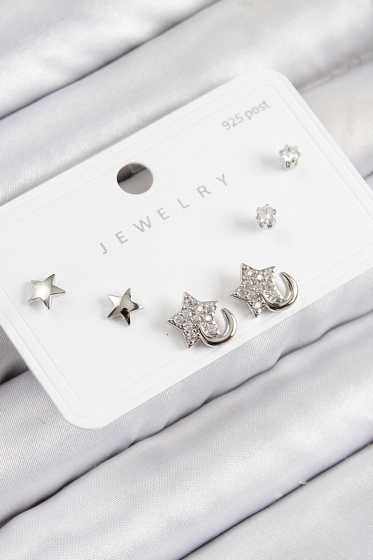 Pirinç Zirkon Taşlı Yıldız Model Gümüş Renk 925 Ayar Gümüş Çivi Kadın Küpe Set - TJ-BKP11177